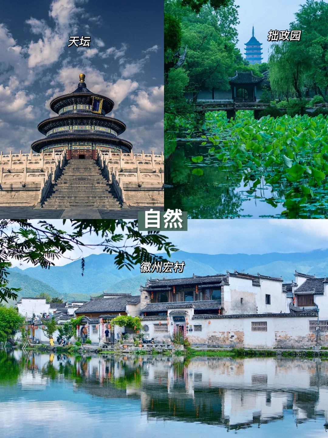 🔹首先是自然,环境上,天坛坐落空旷,似与天地相接;古村倚山临江,纵享清风明月;园林筑山理水,营造壶中天地。
