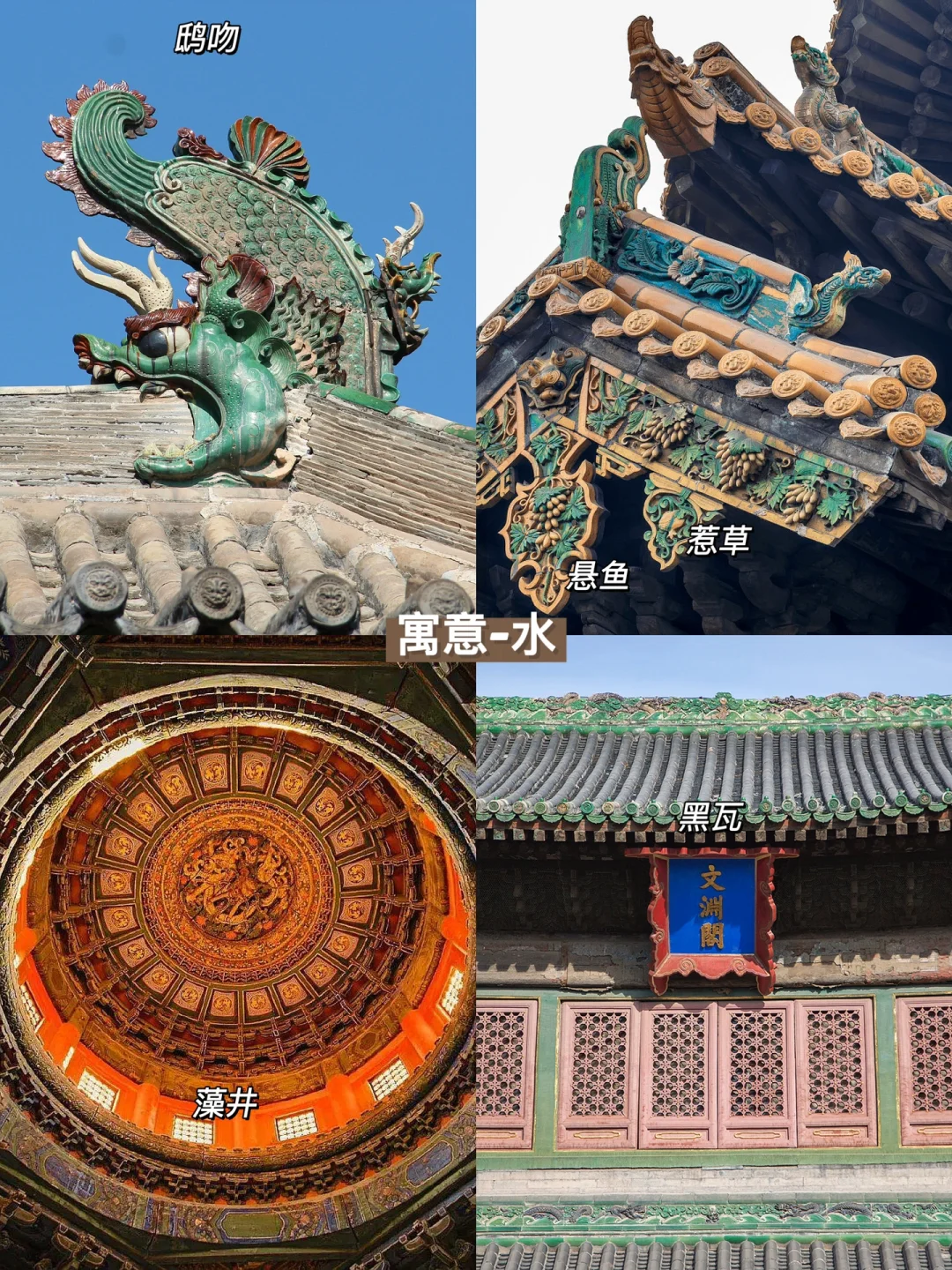 🔹最后,任何形式都会被放进寓意里。中式建筑多用木材,对水的寓意尤为看重,所以无论是屋脊的鸱吻、博风板的悬鱼、惹草,还是天花板的藻井、文渊阁的黑瓦,都有着属水灭火的含义。