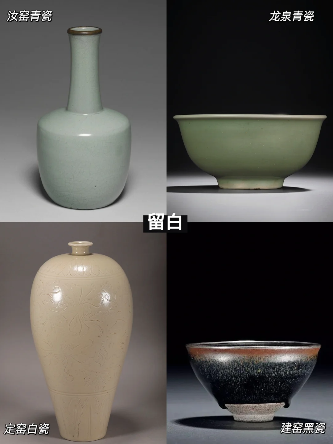 -宋瓷中,汝窑青瓷,细腻简素;龙泉青瓷,透亮如玉;定窑白瓷,浅带印痕;建窑黑瓷,几点斑花,均为宋人“清水出芙蓉,天然去雕饰”的美学体现。