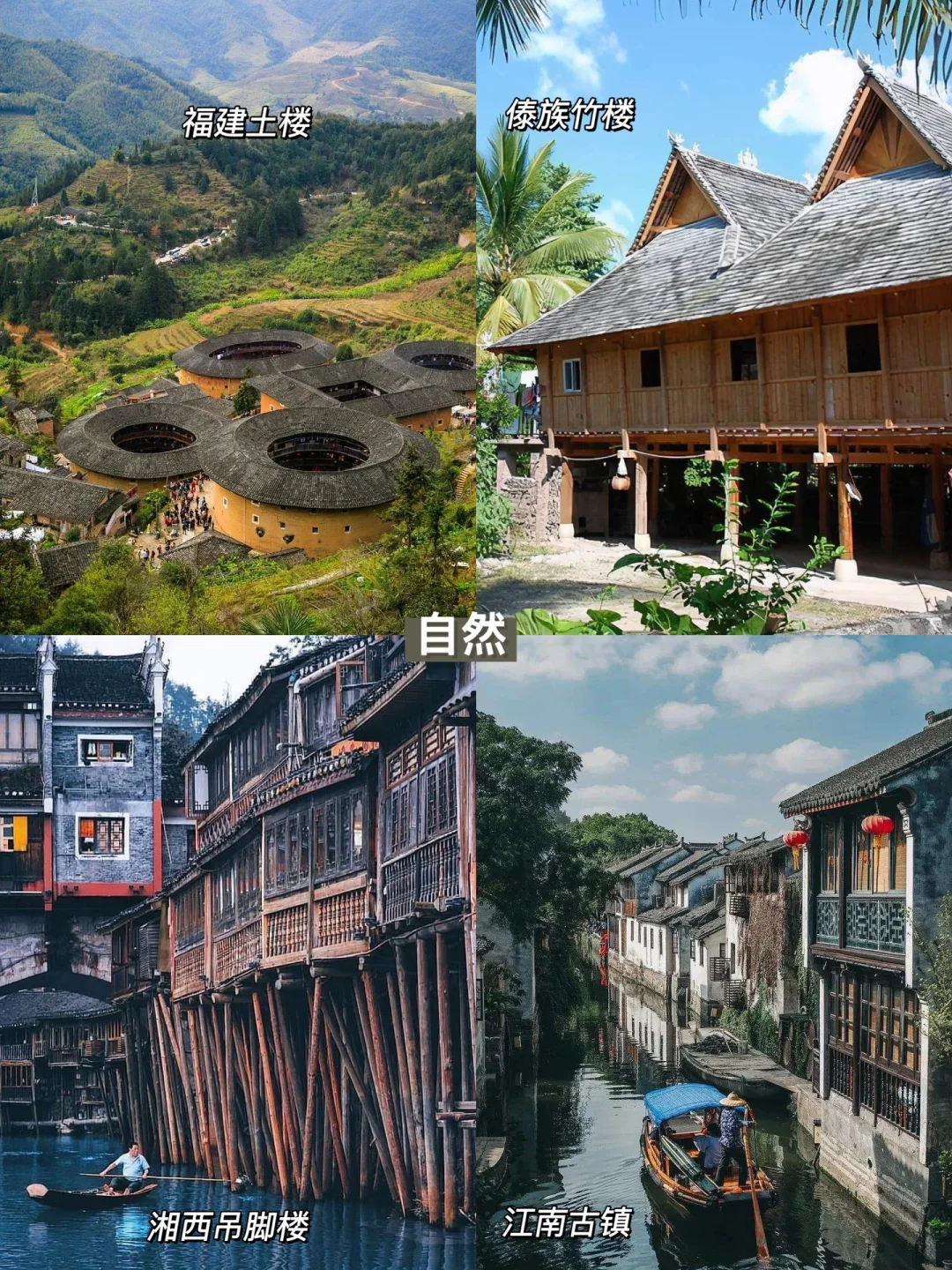 -材料上,以土建房的陕北窑洞、福建土楼;以竹建房的湘西吊脚楼、傣族竹楼;以木石建房的江南古镇、秦淮河房,均取之自然。