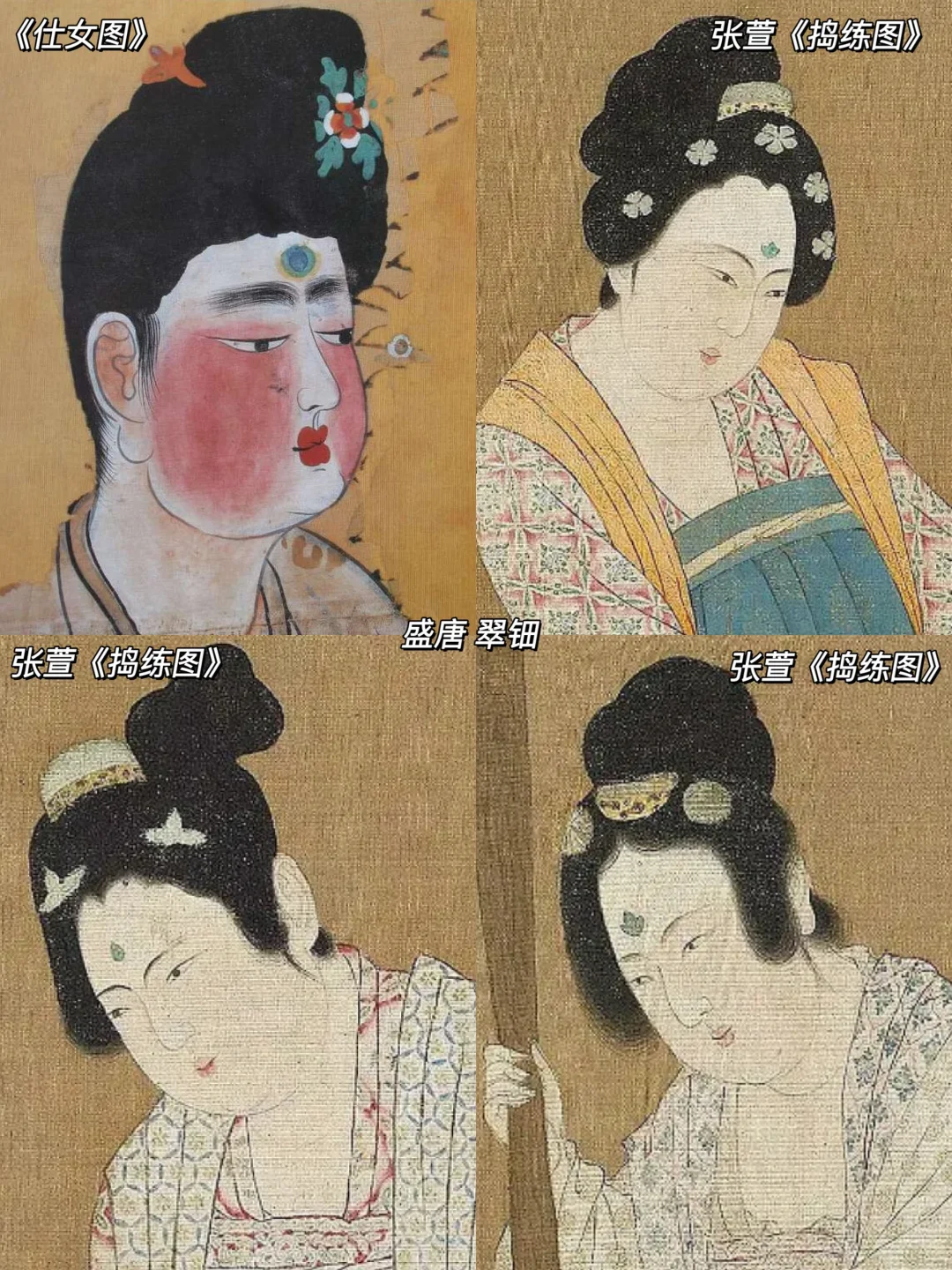 翠钿是以绿色羽毛制成,在张萱的《捣练图》中也可看到它的身影。由以上可知,盛唐花钿样式繁多,大方得体。