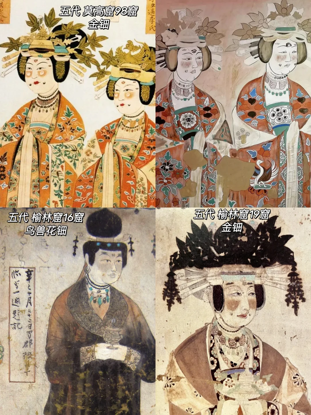 而在榆林窟第16窟中,曹议金夫人回鹘公主则展现出回鹘装扮与鸟兽花钿的完美结合。
