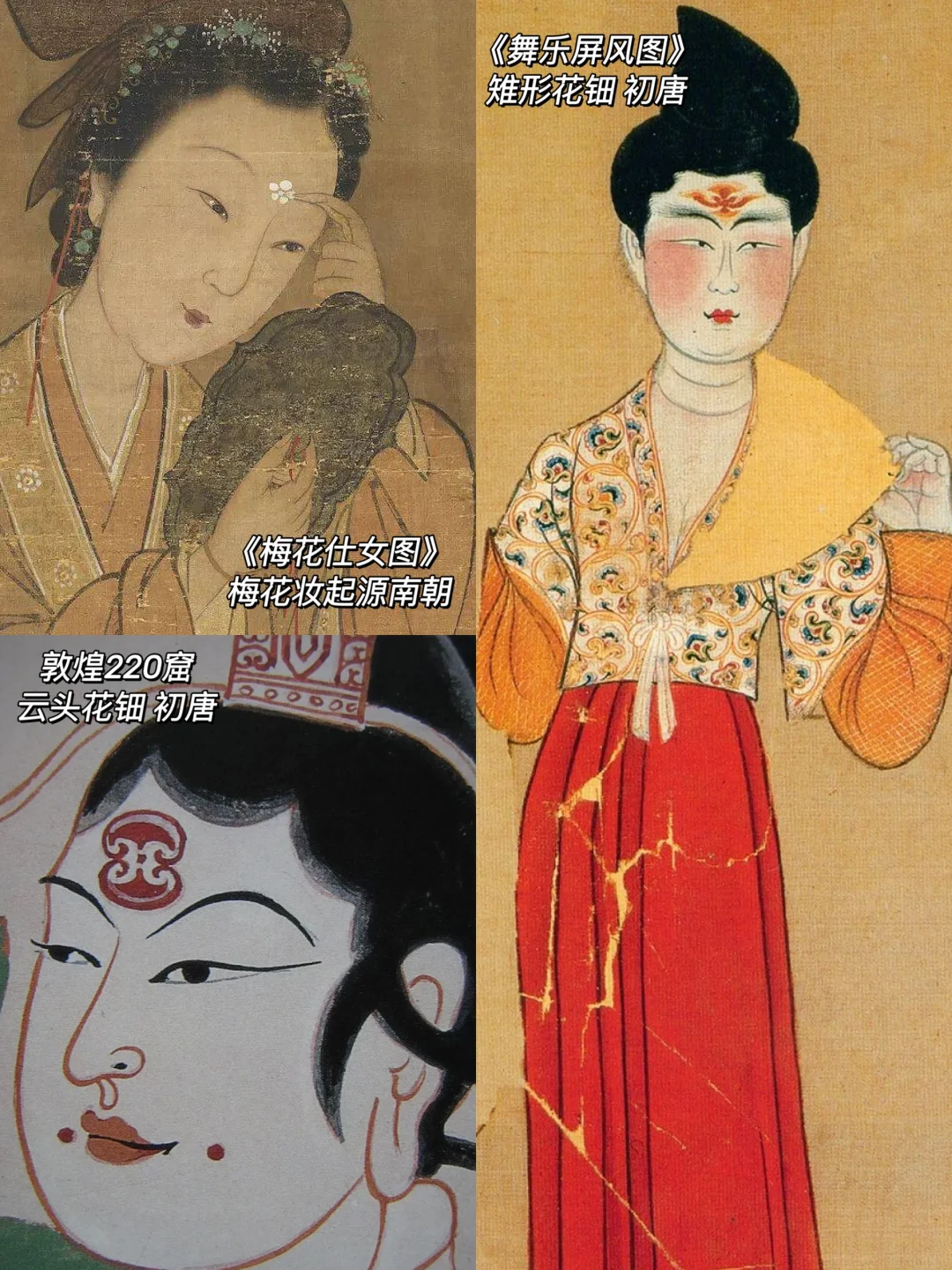 🎀花钿盛于唐朝,初唐样式可见新疆吐鲁番阿斯塔那张礼臣墓的《舞乐屏风图》。画中女子额间绘有雉形花钿,灵动而飘逸。