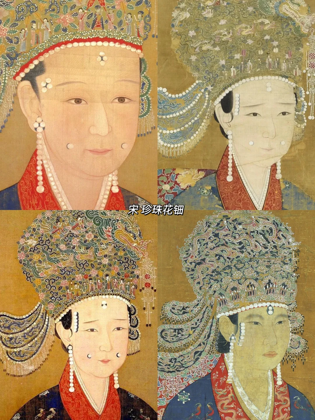 🎀到了宋代,淡雅之风开始盛行,从前红、黄、绿、金的花钿也被精致的珍珠所取代。众多皇后画像显示,她们的额头、太阳穴、嘴角、甚至鬓角,都会被洁白的珍珠装饰一番。