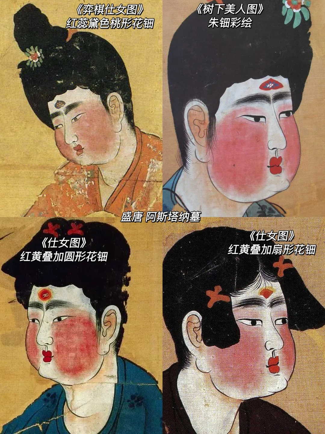 🎀同样出土于阿斯塔纳墓的另一些画则来自盛唐,《弈棋仕女图》中有红色花蕊的青黑色桃形花钿;《树下美人图》中有白蕊青花的红唇形花钿;《仕女图》中有黄红叠加的圆形和扇形花钿以及额黄贴翠钿的同心圆花钿。