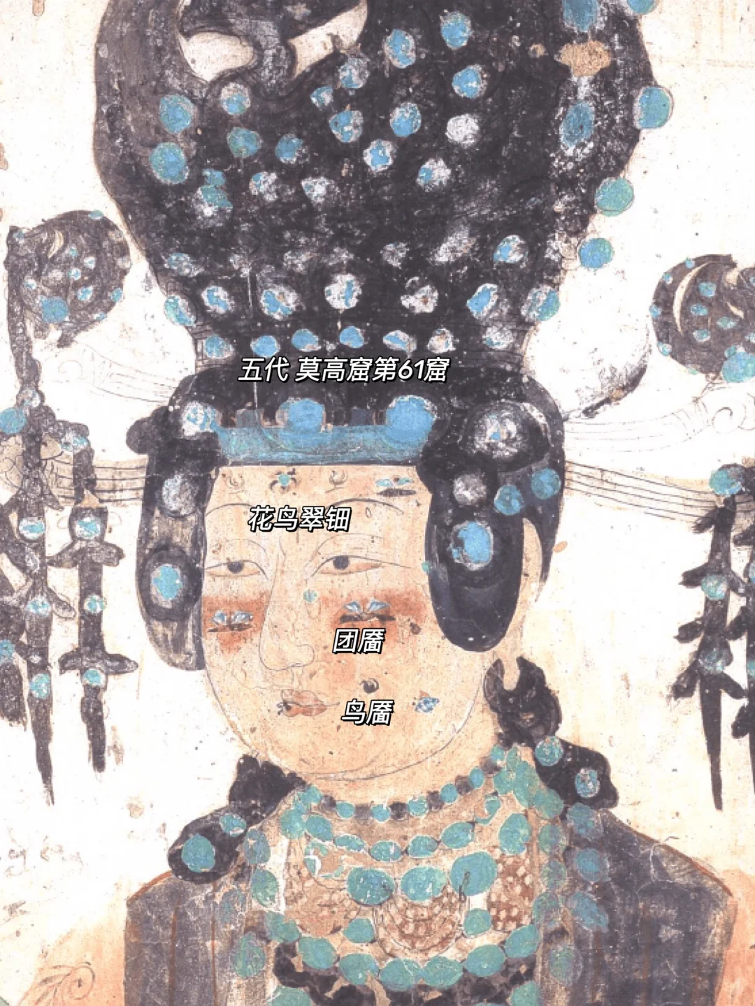 🎀不过时至五代,贵妇间又兴起了繁多、复杂的花钿,在莫高窟第61窟东壁,于阗皇后不仅额上有花鸟翠钿,还有将黑光纸剪裁贴于脸颊的“团靥”,以及模仿梨涡,装饰于嘴角两侧的“鸟靥”,犹如一幅装备齐全的穿戴甲。