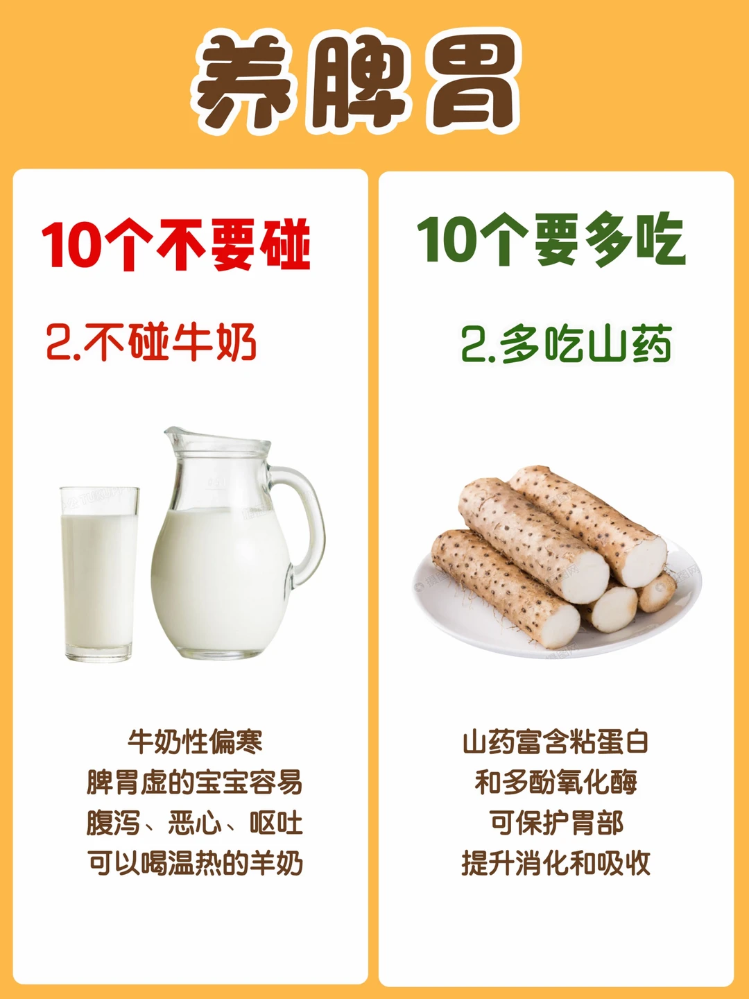 🍀多吃山药:干山药泡水喝养胃,山药炒菜煮粥都可以。