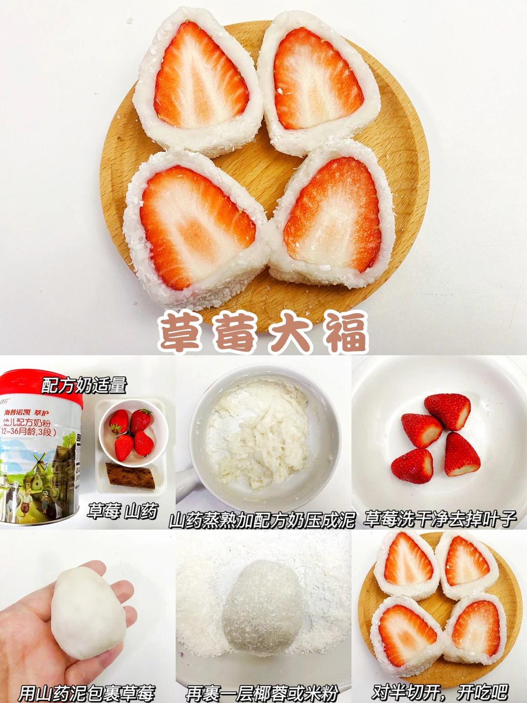 1.草莓洗干净去掉根部。山药上锅蒸熟后加适量配方奶压成泥。