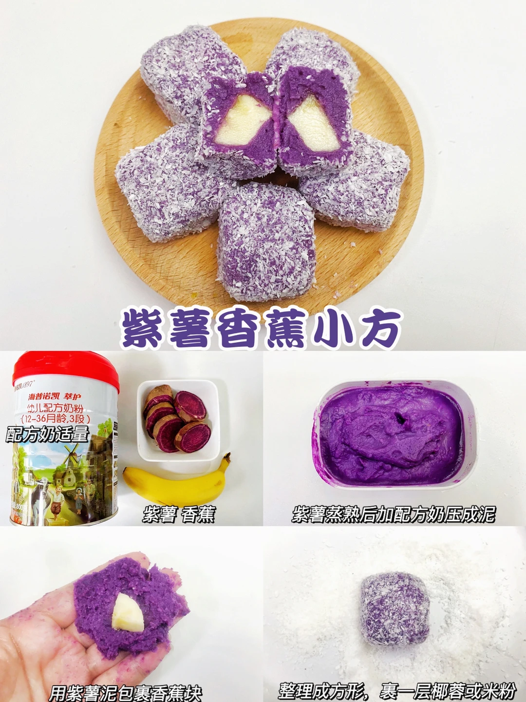 1.紫薯上锅蒸熟后加适量配方奶压成泥。