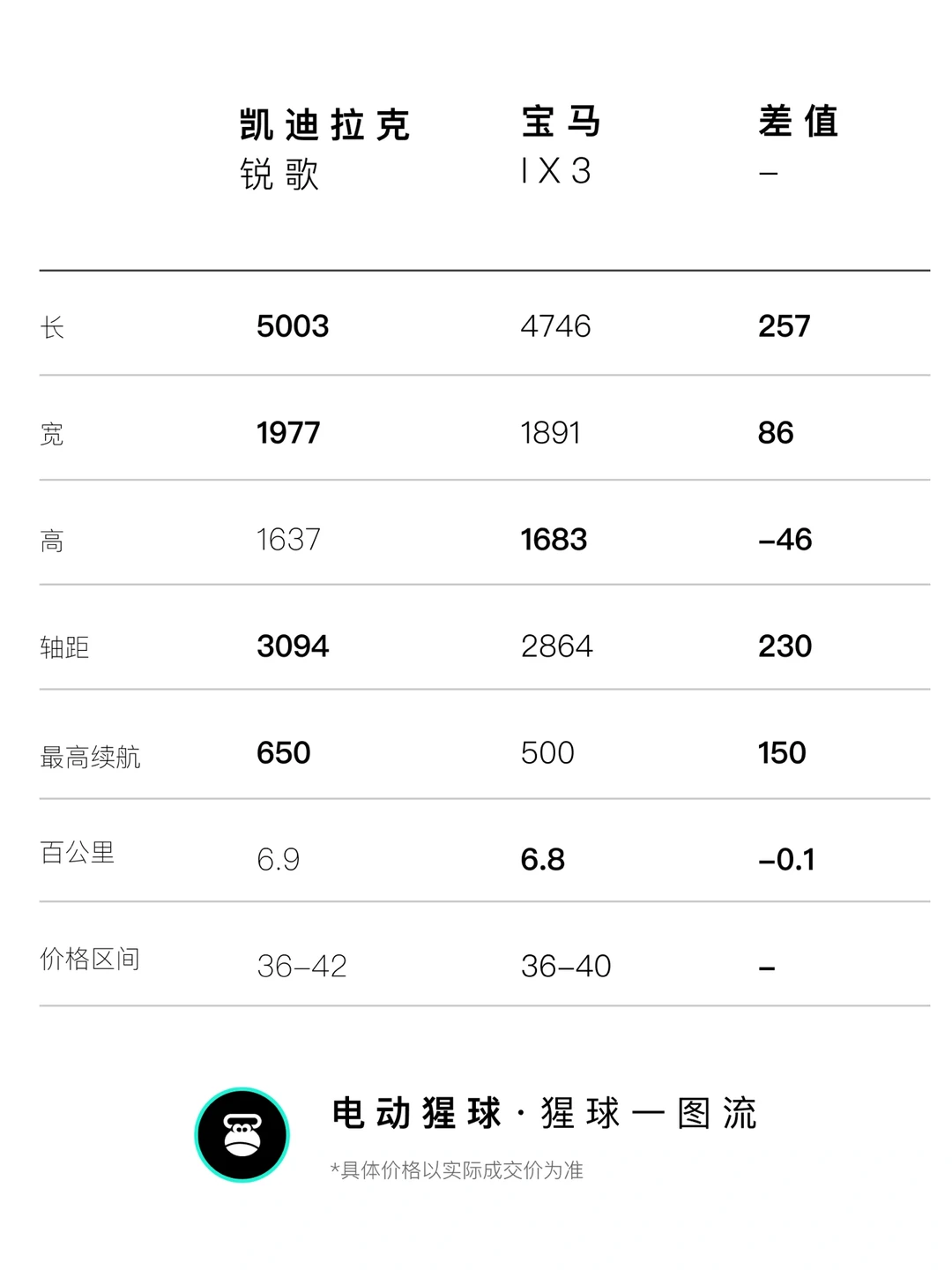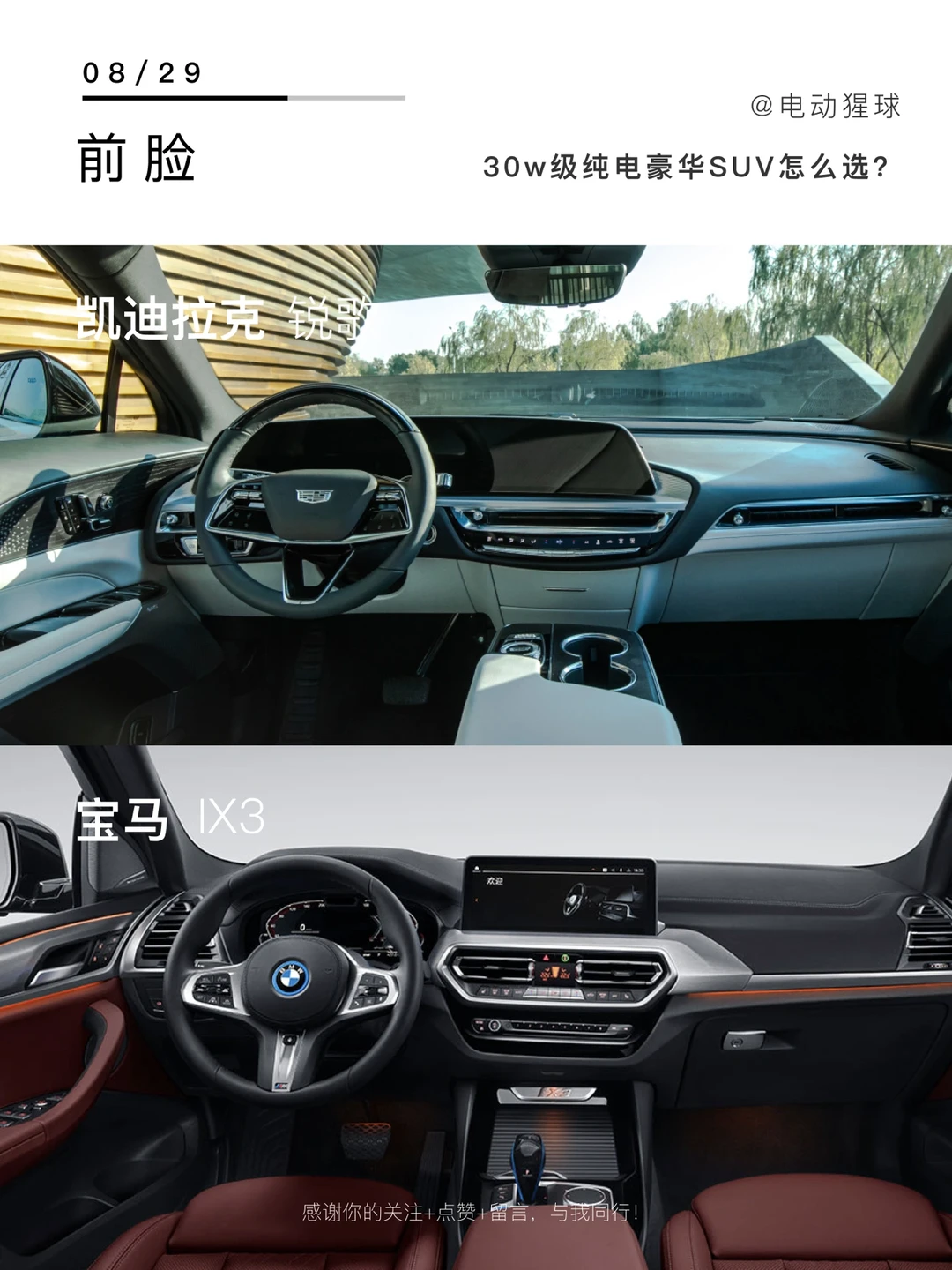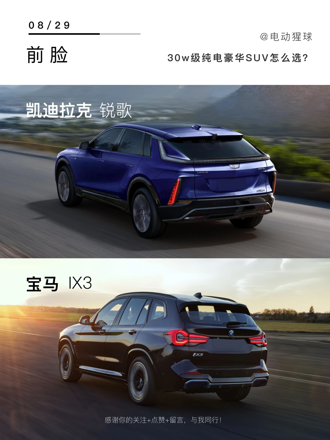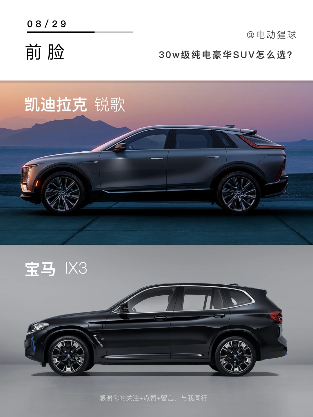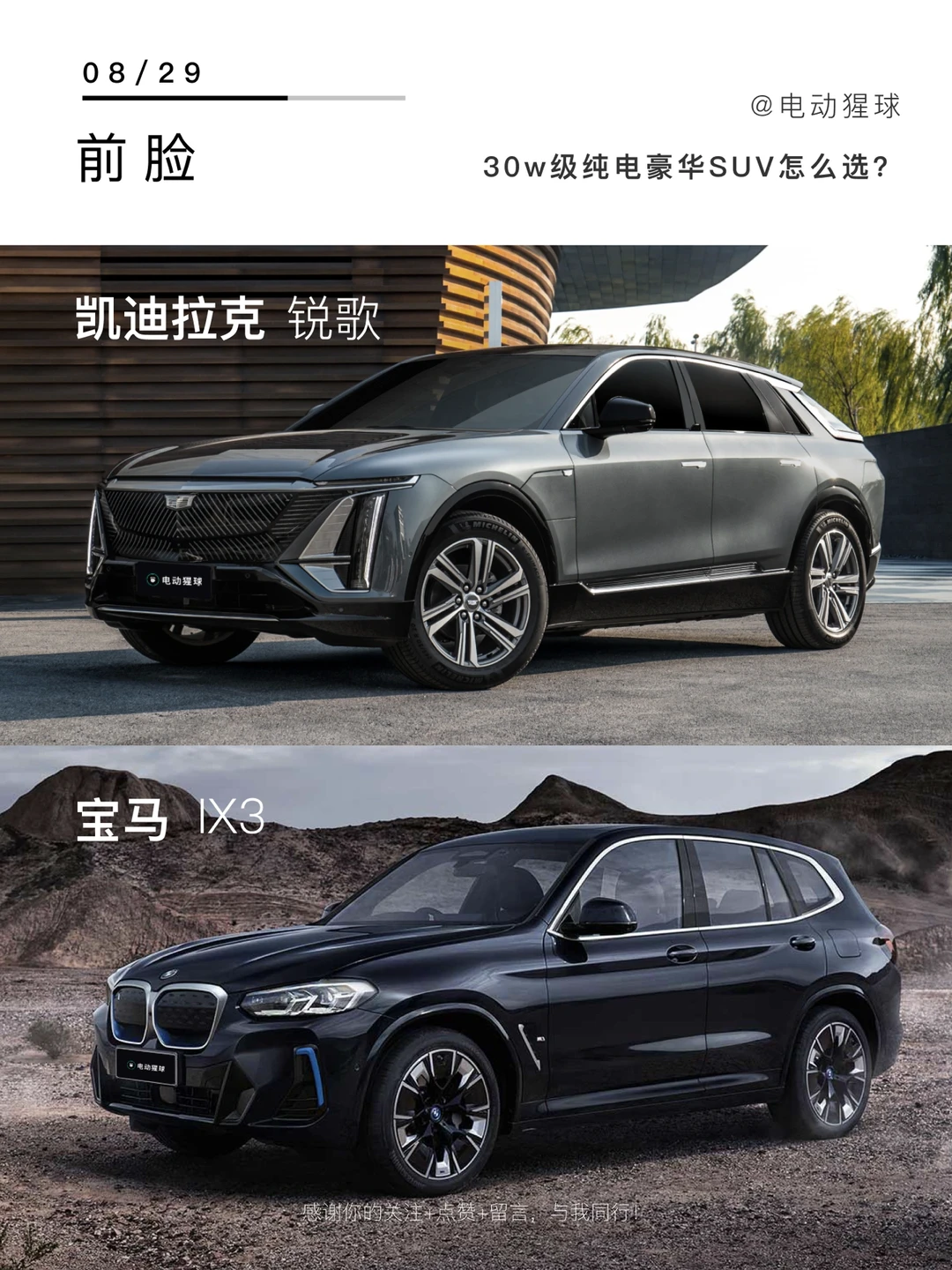 传统豪华品牌电动化的牌面IX3,与燃油版X3一脉相承的设计,追求实打实的500续航,口碑和销量远超德系兄弟奔驰EQ系列。另一个强大对手,美式豪华纯电凯迪拉克锐歌,修长的非传统SUV风格、大溜背线条,搭配前光曜格栅的科技感和牌面满满、同样实打实且突破600+的续航力,手握30个W,一个更像油车,一个纯电风格拉满,你怎么选?