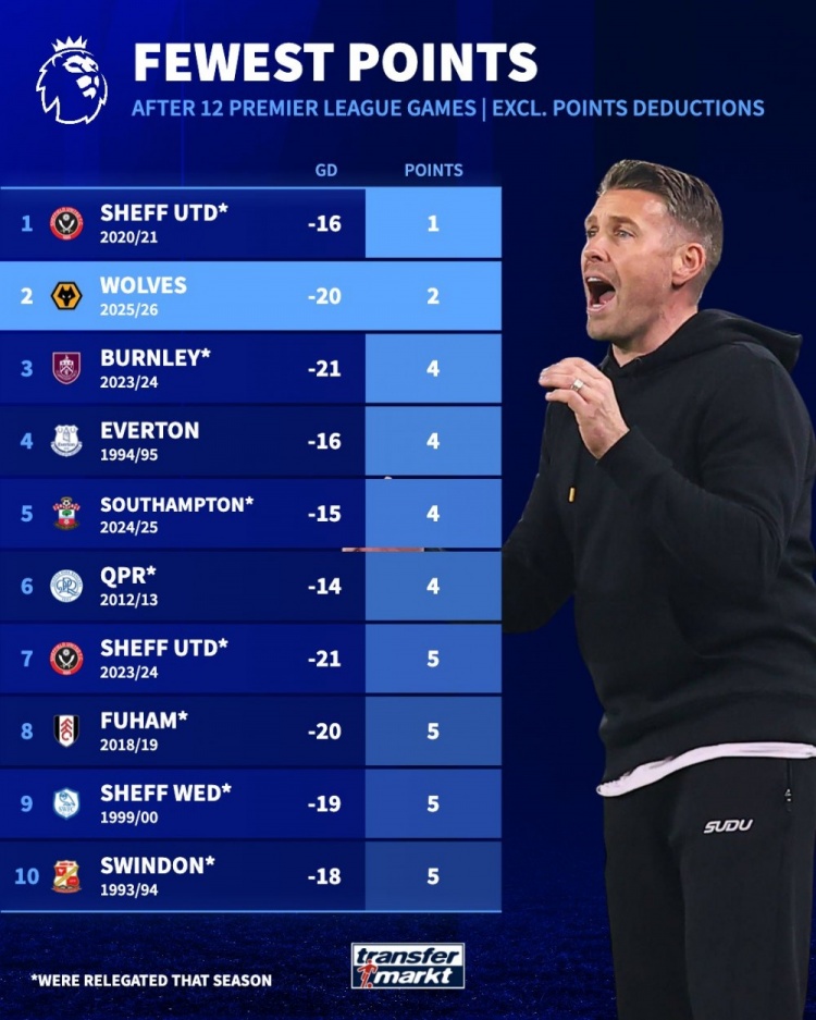 直播吧11月26日讯狼队在本赛季表现低迷,12轮后仅积2分,《转会市场》统计显示他们也是英超历史同期战绩倒数第二。