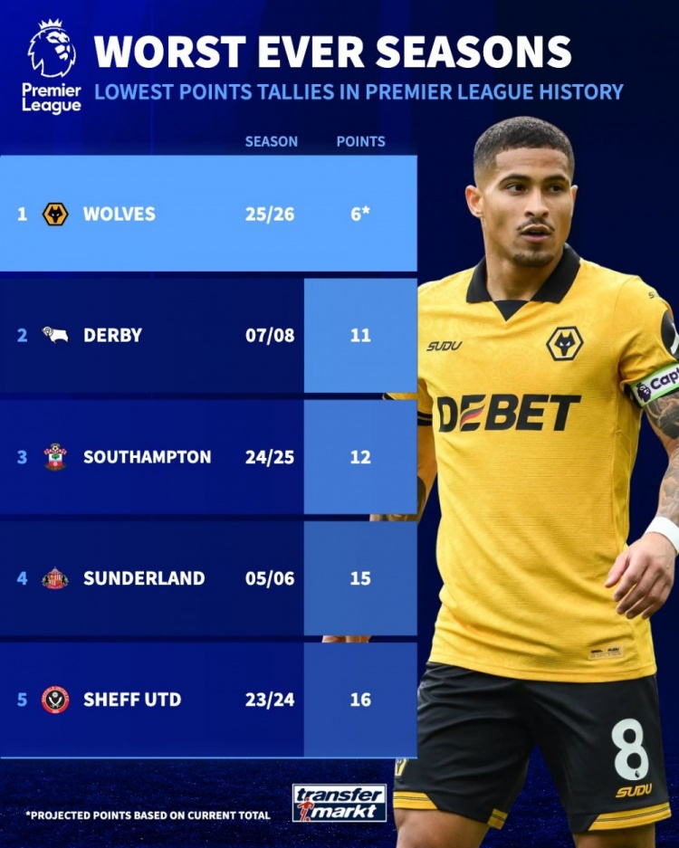 如果换算为38轮联赛,狼队将在本赛季仅积6分。这也将打破德比郡在07/08赛季的11分单赛季英超最低积分纪录。