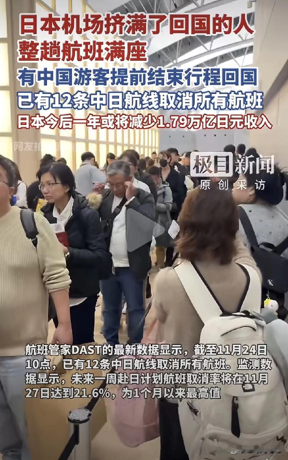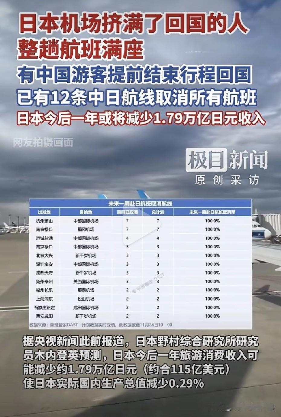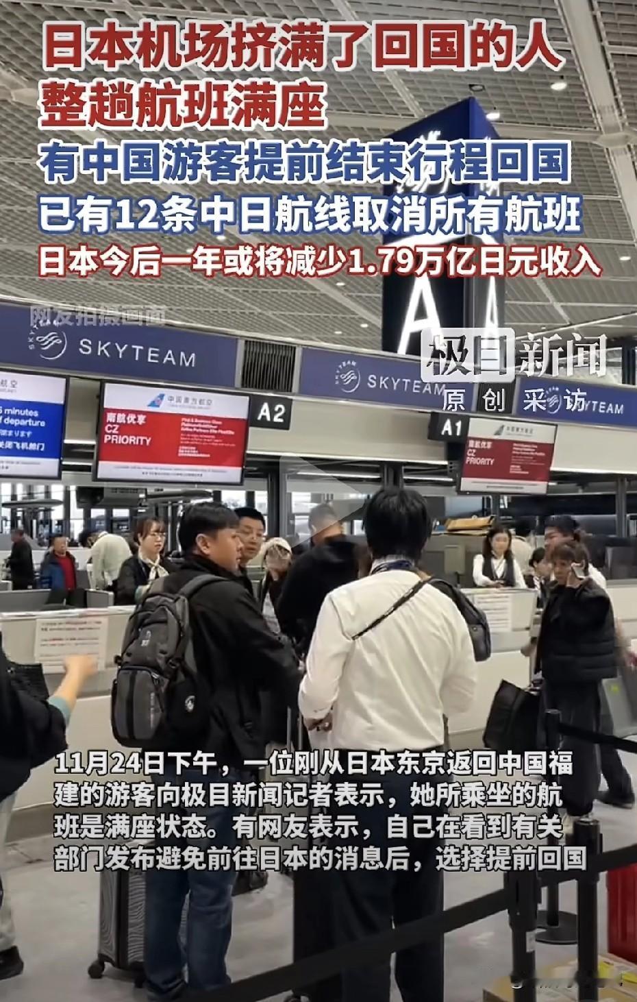 25日,日本多座机场被普通话、粤语、川渝、东北等方言集体“包围”。成田、关西、福冈……放眼望去全是拉杆箱+口罩的熟悉组合,安检口拐出七道弯,免税店收银员说:“从没见过中国人把退税柜台围成景点。”原因简单:家里来电一句“早点回来”。 航班管家的最新“战报”:24小时内12条中日航线直接“蒸发”,天津—关西取消率飙到65%,南京—关西逼近60%。机票价格原地起飞,经济舱卖出商务舱价,仍挡不住“全勤”客座率。网友晒出登机牌:“提前7天改签,多花4000块,但心安比日元汇率更值钱。” 更硬核的操作是“辞职式回国”。社交平台上,几位在日本做IT、餐饮的同胞晒出离职证明+护照盖章:“工可以再打,安全感不能缺失。” 有人调侃:“这波叫‘反向润’,行李里塞满白色恋人,心里装着中国红。” 日媒镜头里,空荡荡的入境通道与爆满的出境大厅形成鲜明对比。药妆店、电器城少了扫货大军,老板把“欢迎光临”改成“期待再会”。而国内网友刷屏:春运提前彩排,目的地叫——家! 如果是您,会果断提前回国,还是按计划走完行程?欢迎评论区聊聊你的看法。 [图源:@极目新闻]