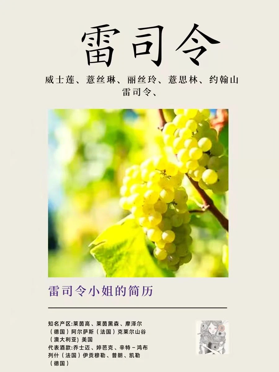 💫雷司令:是德国最古老的葡萄品种之一,同时雷司令已经成为了德国葡萄种植业的一面旗帜,它对于德国葡萄酒的世界形象,起着举足 轻重的作用,非任何其它葡萄品种可比。
