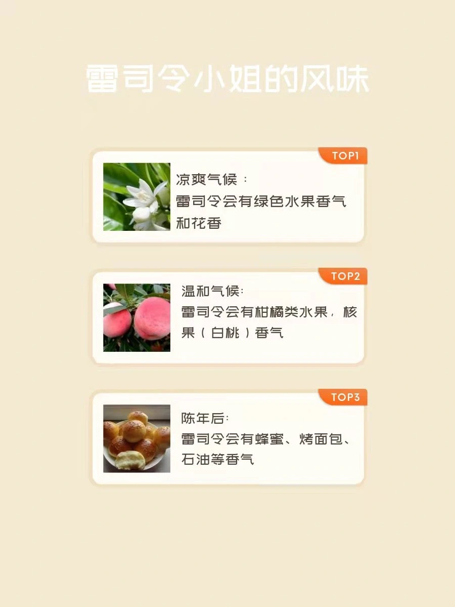 💫葡萄酒特点:带有淡雅的花香和植物香,常伴有蜂蜜和矿物质的香味。酸度高、口感丰富、细腻、均衡,适宜久存。品尝雷司令的只要味道有:蜂蜜,苹果,青柠,蜜桃味道。