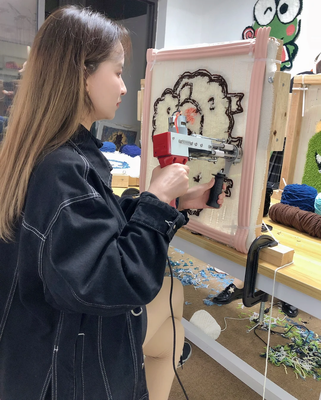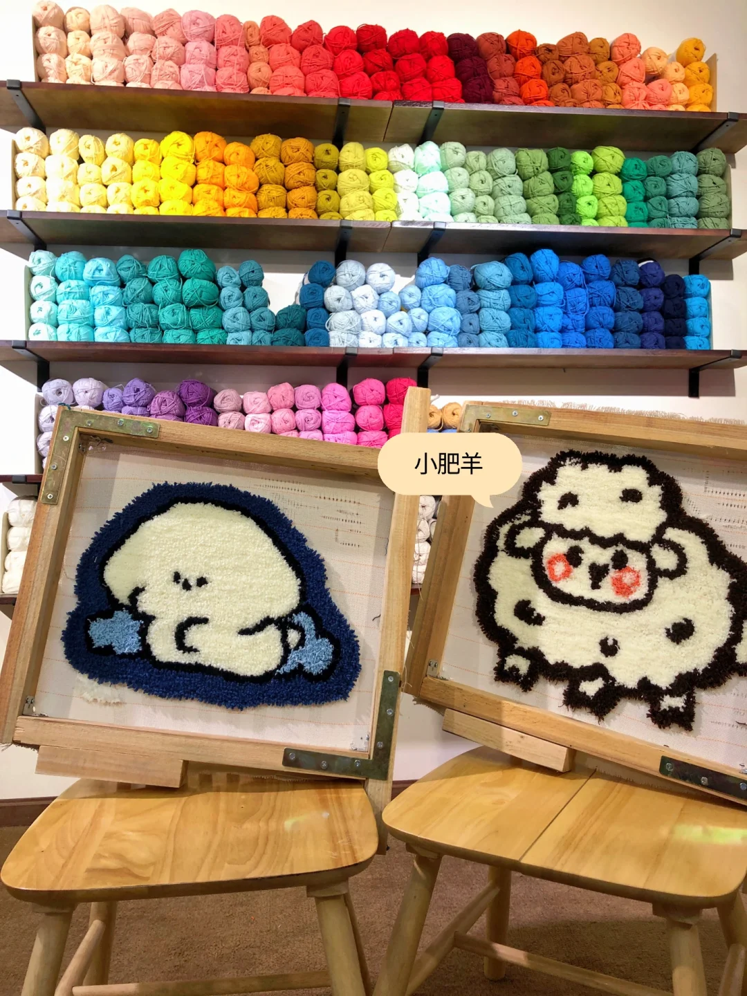 老板会把你想要的画投影到画板上,用马克笔照着描一遍就可以啦,没有画画基础也不用担心,接下来选好需要的毛线颜色🧶,然后就是老板教你如何操作,不得不说老板人无敌好,很有耐心!!!❤️❤️❤️❤️