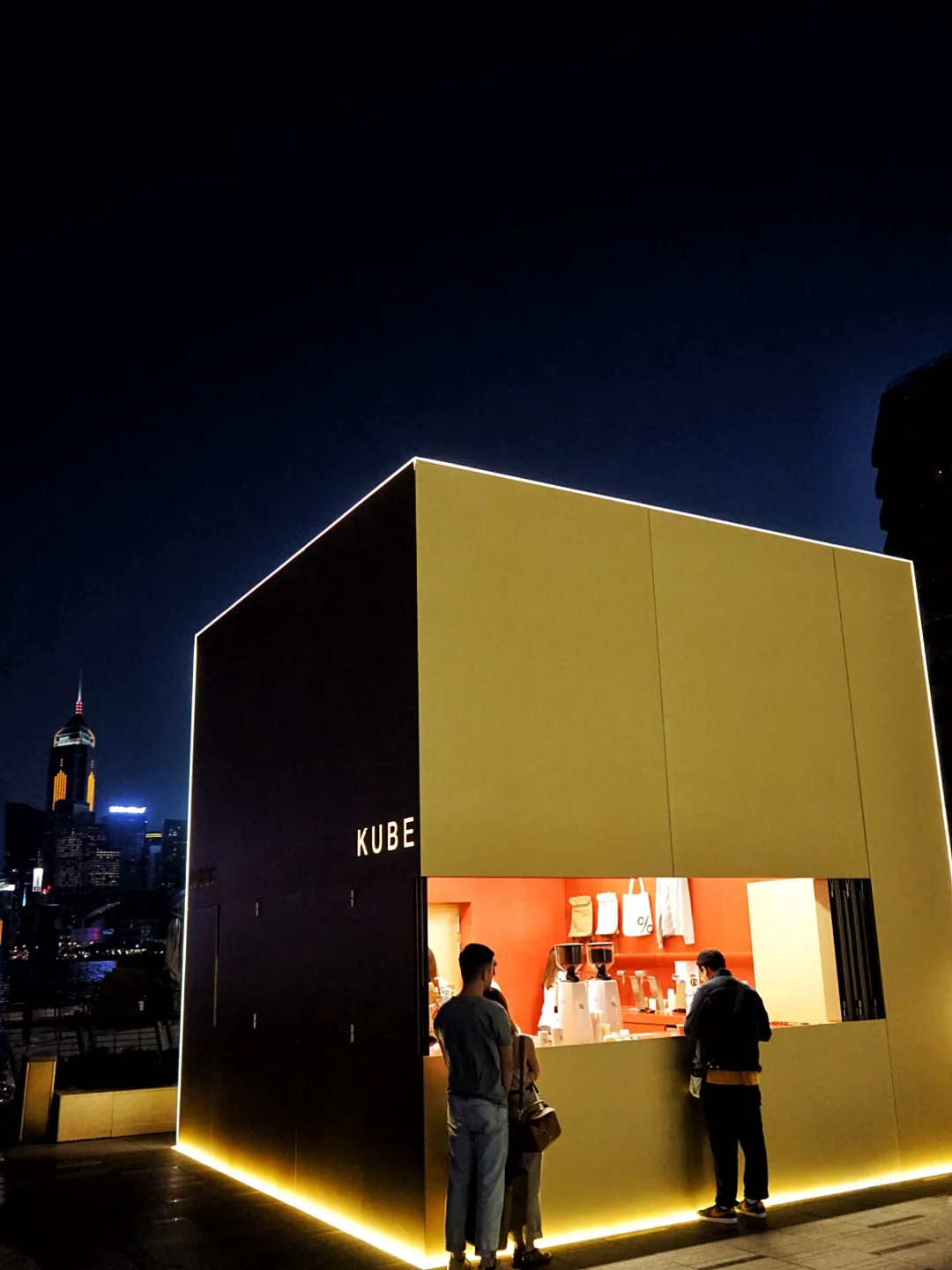 ☕️🌊2⃣️这家【Kube】于11🈷️6日开业。它的设计、配色真的非常摩登时髦,是和荷兰🇳🇱著名建筑公司OMA合作的。这个金色立方的咖啡亭,如它的名字“Kube”,四四方方,非常可爱。据说灵感来自香港本土街边大排档。的确中环铁皮屋的大排档即是如此。Kube边上是一排排的大理石座椅,欣赏180度维港景,十分惬意。我来到Kube大约黄昏,看夕阳西下,维港华灯初上,Aqua的红色张保仔船还在维港穿梭,很chill
