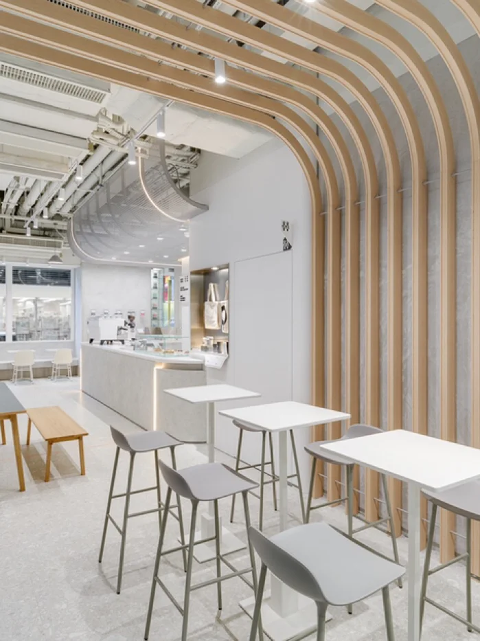 ☕️☕️咖啡L 型的咖啡吧设计,配合LED的灯光,简约明亮,很适合拍照的灯光。墙壁添加了木条的元素,整个空间达到冷暖色平衡。挑高的玻璃窗看店外街道来来往往的人群,似乎人能从心浮气躁中安静下来。