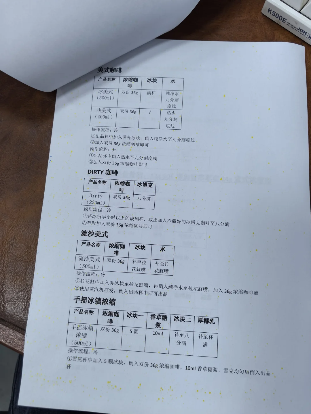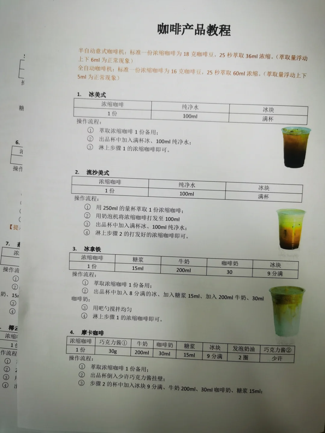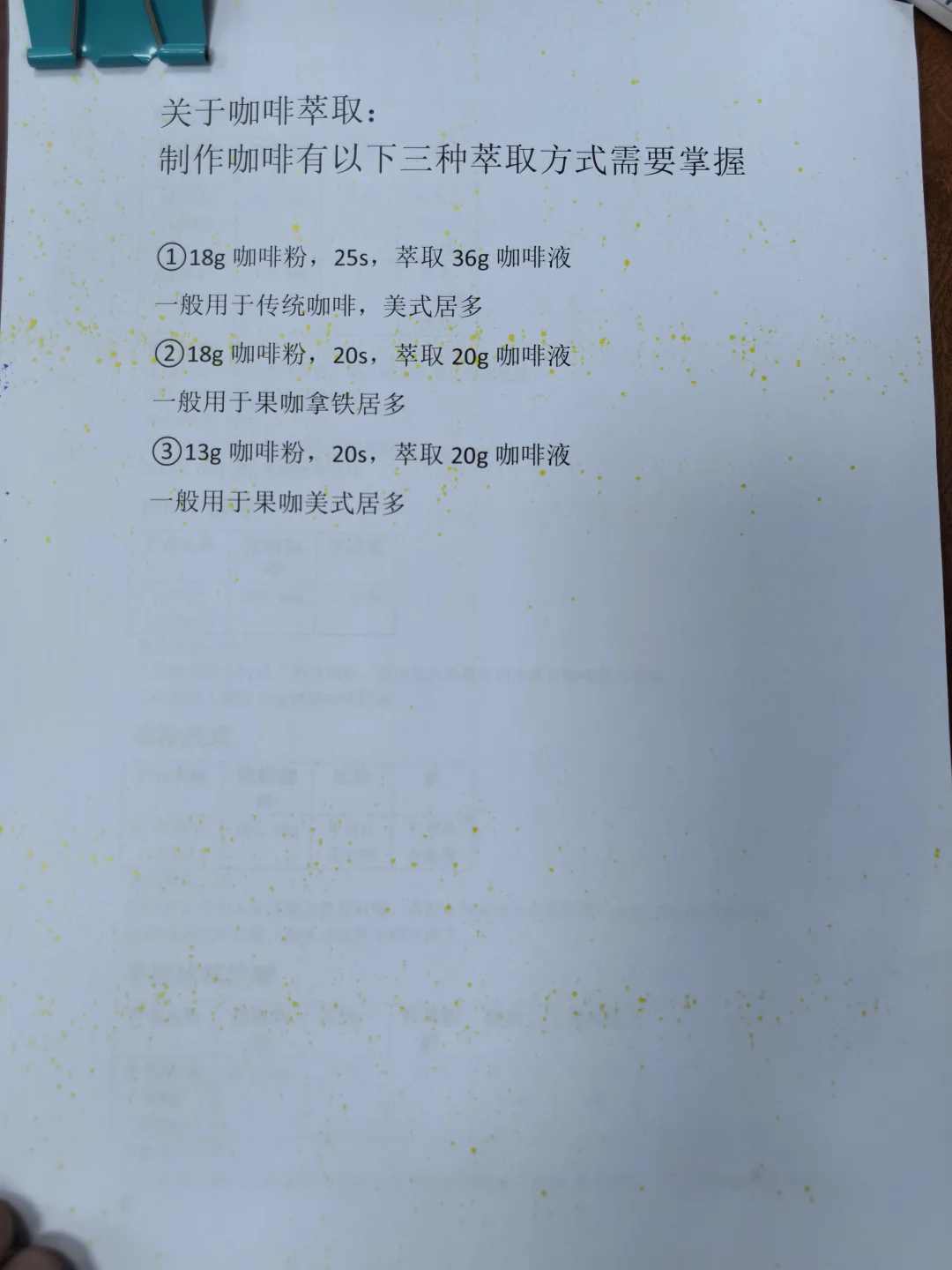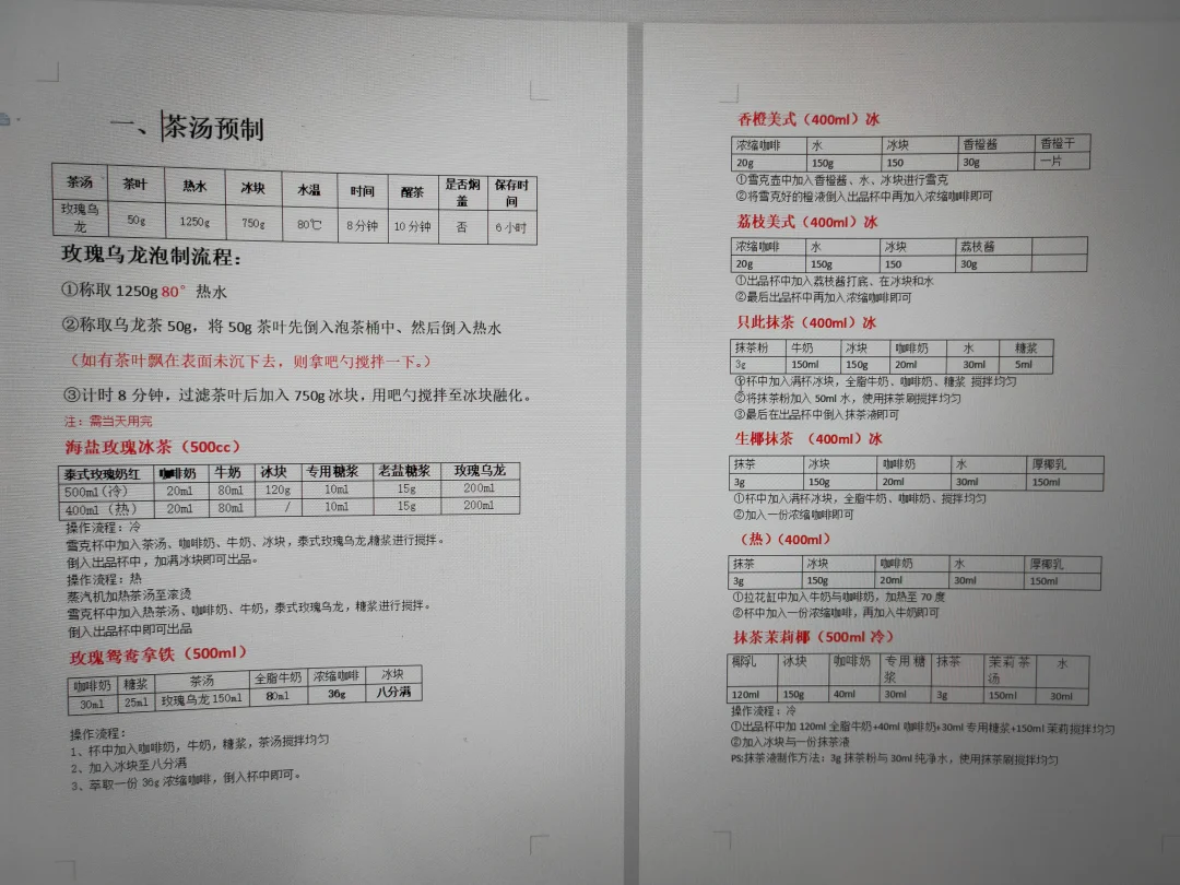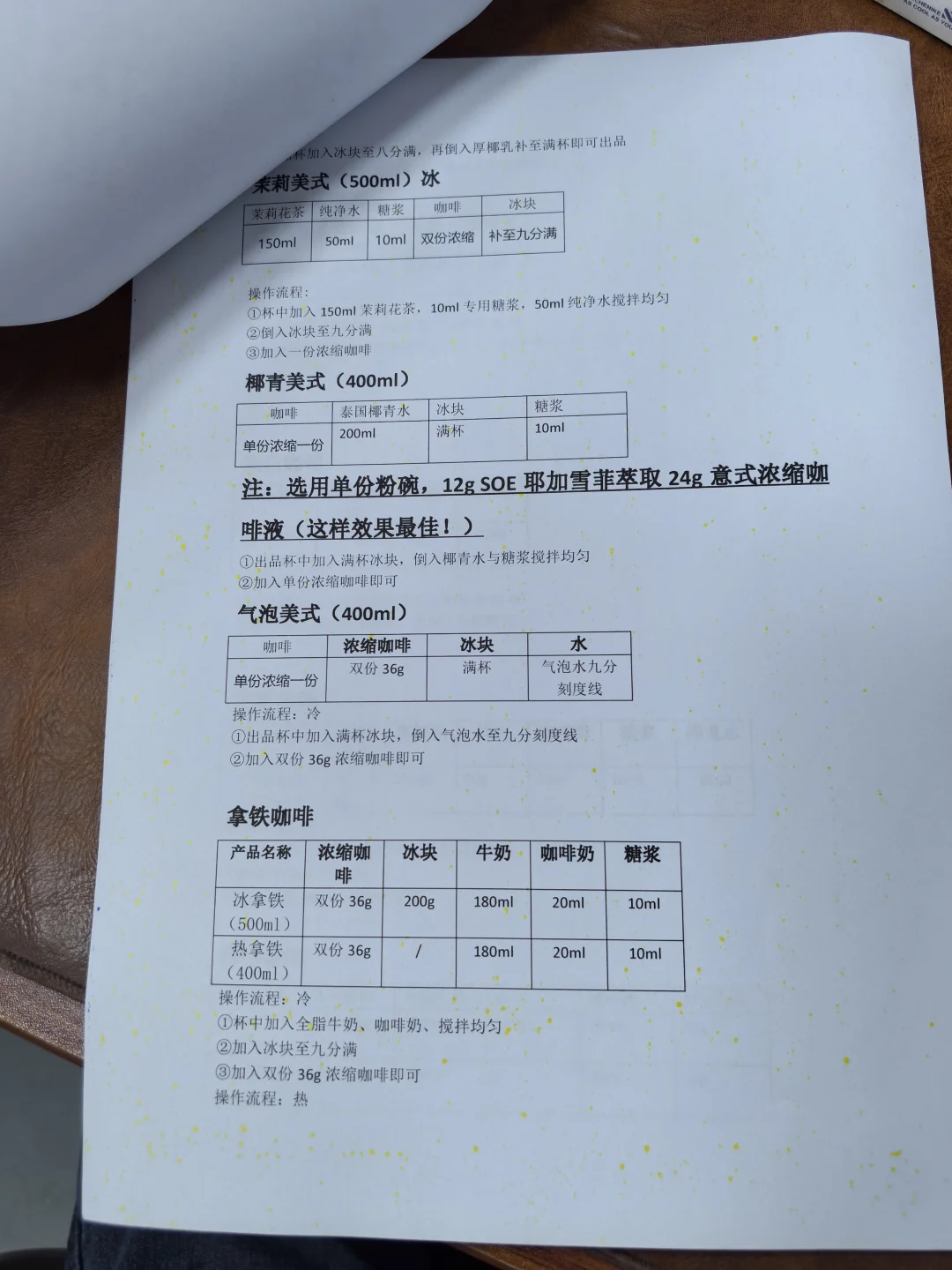 整理咖啡配方,保留核心步骤,有电子文档。 [彩虹R][彩虹R]电 [勾引R][勾引R]子 [扯脸H][扯脸H]档 ☕ **传统美式类** [一R] 冰美式(500ml) ① 满杯冰块 + 纯净水至九分满 ② 加1份浓缩咖啡 [二R] 热美式(450ml) ① 八分满热水 + 1份浓缩咖啡 [三R]椰青美式(450ml)冰 ① 满杯冰块 + 250ml椰青水+10ml糖浆 ② 加1份浓缩咖啡 [四R]气泡冰美式(500ml)冰 ① 满杯冰块 + 气泡水至九分满 ② 加1份浓缩咖啡 [五R] 茉莉冰美式(500ml)冰 ① 150ml茉莉花茶+10ml糖浆+50ml水搅匀 ② 加冰块至九分满 ③ 加1份浓缩咖啡 🥛 **传统拿铁类** [一R]冰拿铁(500ml) ① 满杯冰块 + 180ml牛奶+20ml咖啡奶 ② 加1份浓缩咖啡 [二R]热拿铁(350ml) ① 牛奶+咖啡奶加热至65-70℃ ② 加1份浓缩咖啡 [三R]生椰拿铁(500ml) ① 满杯冰块 + 180ml厚椰乳+20ml咖啡奶+5ml糖浆 ② 加1份浓缩咖啡 [四R]燕麦拿铁(500ml)冰 ① 满杯冰块 + 180ml燕麦奶+20ml咖啡奶+10ml糖浆 ② 加1份浓缩咖啡 🌈 **高颜值拿铁** [一R]瓦尔登蓝椰拿铁(500ml)冰 ① 30g蓝椰粉+30g热水搅匀 ② 100ml牛奶+80ml椰奶+60g蓝椰奶混合 ③ 加冰块 + 1份浓缩咖啡 [二R]绿野仙踪(500ml)冰 ① 牛奶+咖啡奶+糖浆搅匀 ② 加冰块至九分满 ③ 左边抹茶液 + 右边咖啡液 [三R]开心拿铁(500ml)冰 ① 杯壁抹开心果酱 ② 牛奶+咖啡奶+糖浆+开心果酱搅匀 ③ 加冰块 + 1份浓缩咖啡 🍓 **水果咖啡系列** [一R]榴莲椰拿铁(400ml)冰 ① 50g榴莲泥 + 冰块 ② 150ml椰乳+20ml咖啡奶+5ml糖浆 ③ 加20g浓缩咖啡 [二R]茉莉手打柠咖(700ml)冰 ① 爆锤40g香水柠檬+糖浆+茉莉茶汤 ② 补冰摇晃 + 20g浓缩咖啡 [三R]荔枝美式(500ml)冰 ① 150ml荔枝原浆+10ml糖浆搅匀 ② 加冰块+100ml气泡水 ③ 加1份浓缩咖啡 🍵 **鸳鸯拿铁系列** [一R]红茶鸳鸯(500ml)冰 ① 牛奶+咖啡奶+红茶+糖浆搅匀 ② 加冰块至九分满 ③ 加1份浓缩咖啡 [二R]白桃鸳鸯(500ml)冰 ① 同红茶鸳鸯配方,替换为白桃茶汤 🧀 海盐芝士美式系列 [二R] 芝士白桃美式(500ml)冰 ① 白桃茶汤+糖浆+浓缩咖啡搅匀 ② 加冰块 + 60g芝士奶盖 [烟花R][烟花R] **🌟 小贴士** - 浓缩咖啡标准:18g粉萃36g液,25秒 - 水果类咖啡建议用20g短萃浓缩,风味更佳!