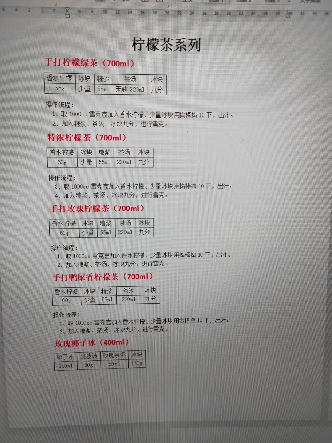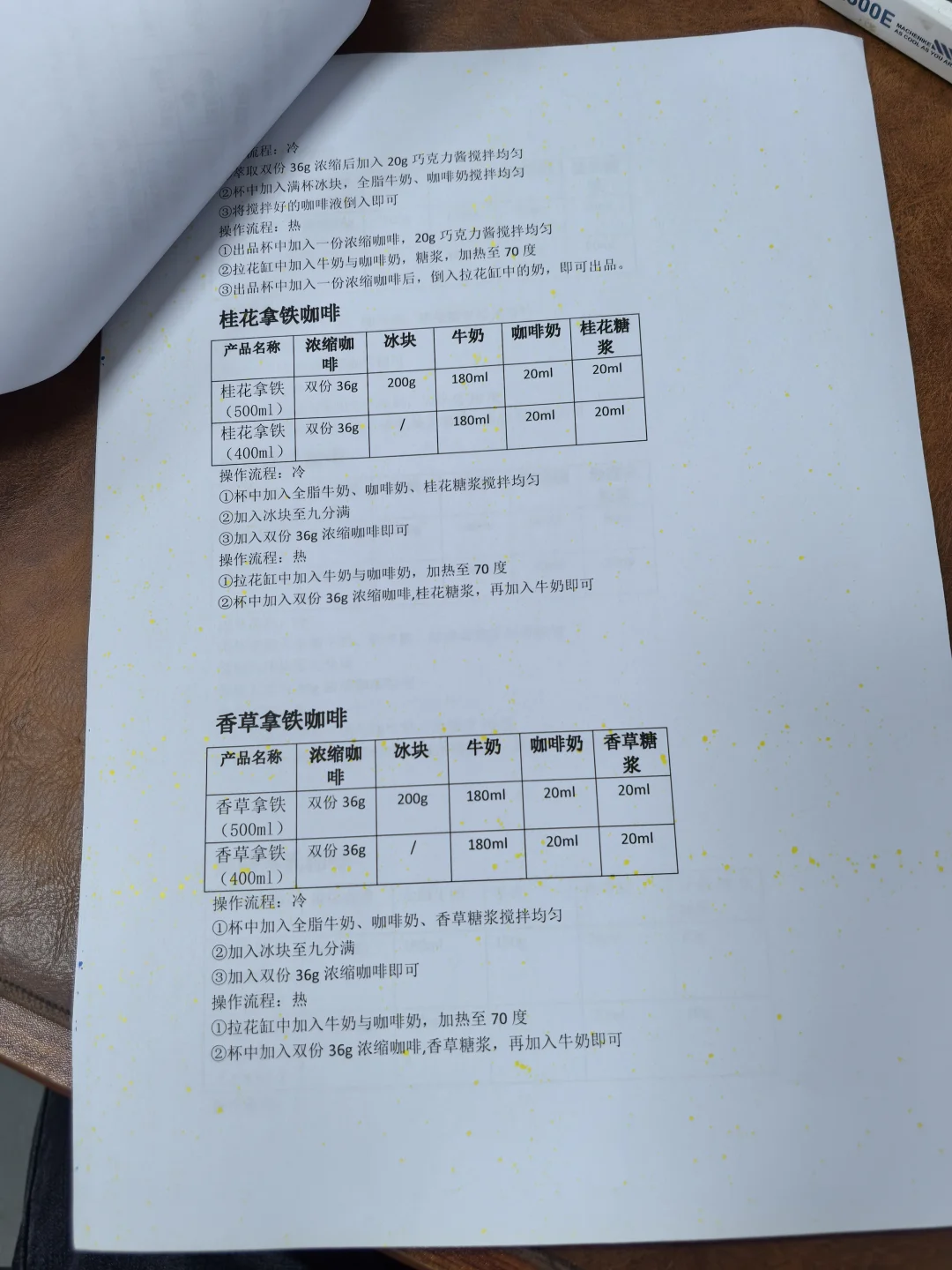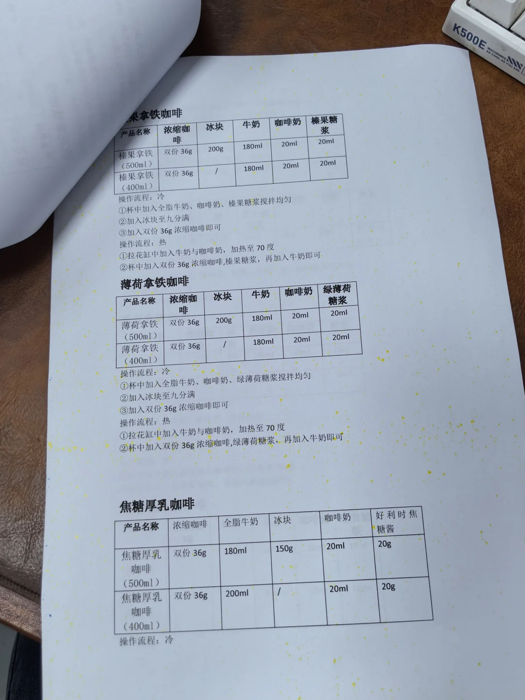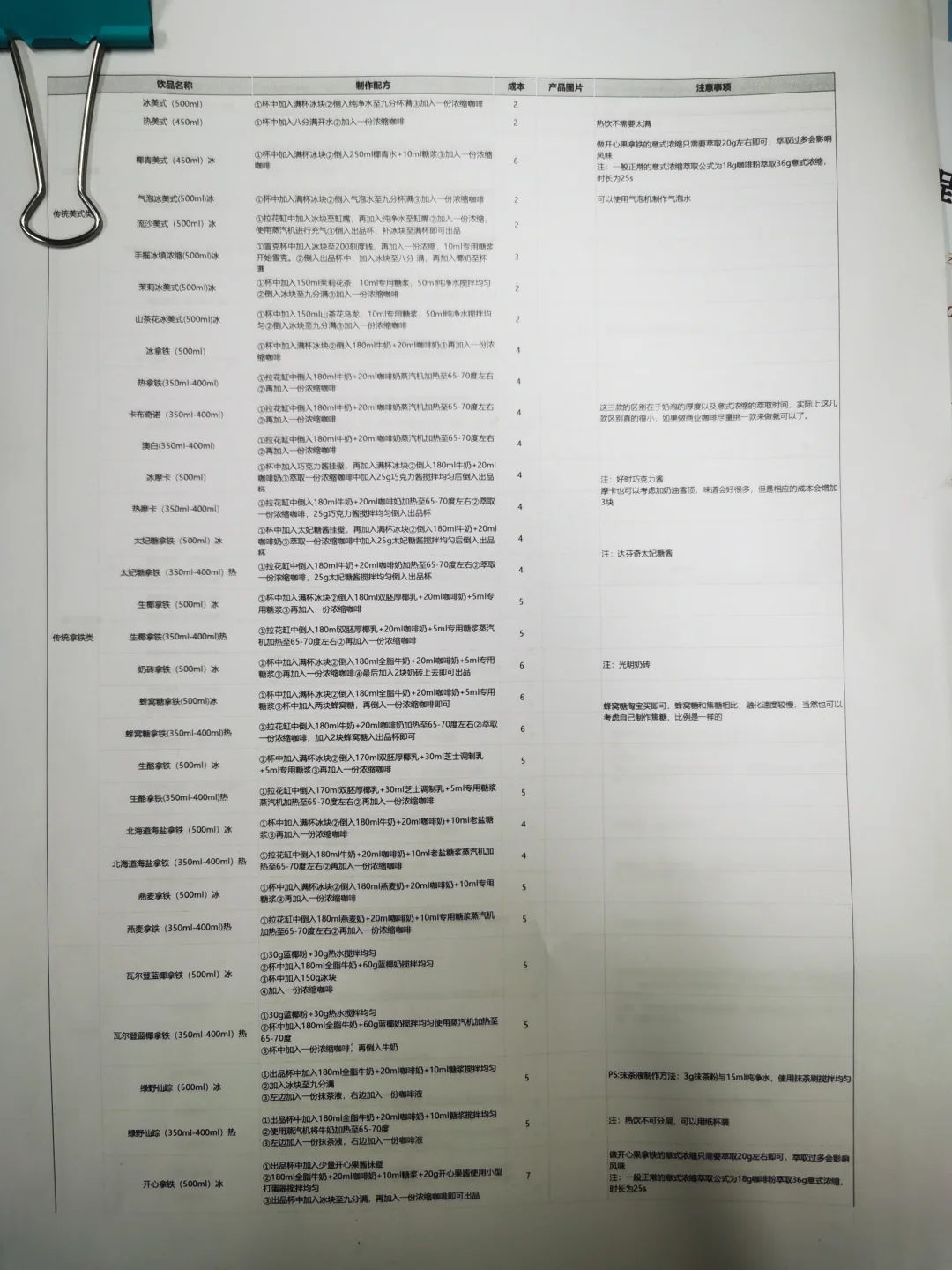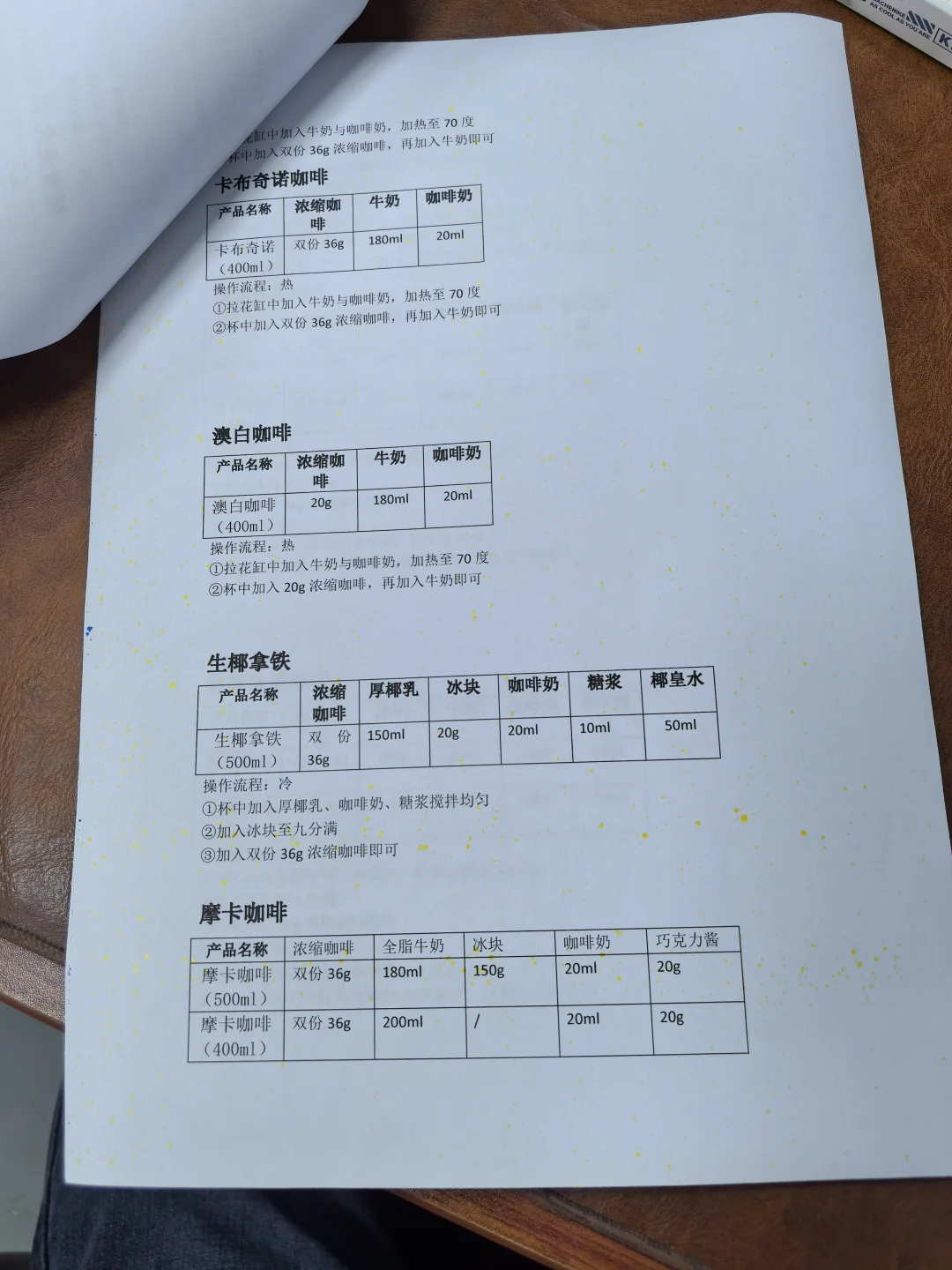 整理咖啡配方,保留核心步骤,有电子文档。 [彩虹R][彩虹R]电 [勾引R][勾引R]子 [扯脸H][扯脸H]档 ☕ **传统美式类** [一R] 冰美式(500ml) ① 满杯冰块 + 纯净水至九分满 ② 加1份浓缩咖啡 [二R] 热美式(450ml) ① 八分满热水 + 1份浓缩咖啡 [三R]椰青美式(450ml)冰 ① 满杯冰块 + 250ml椰青水+10ml糖浆 ② 加1份浓缩咖啡 [四R]气泡冰美式(500ml)冰 ① 满杯冰块 + 气泡水至九分满 ② 加1份浓缩咖啡 [五R] 茉莉冰美式(500ml)冰 ① 150ml茉莉花茶+10ml糖浆+50ml水搅匀 ② 加冰块至九分满 ③ 加1份浓缩咖啡 🥛 **传统拿铁类** [一R]冰拿铁(500ml) ① 满杯冰块 + 180ml牛奶+20ml咖啡奶 ② 加1份浓缩咖啡 [二R]热拿铁(350ml) ① 牛奶+咖啡奶加热至65-70℃ ② 加1份浓缩咖啡 [三R]生椰拿铁(500ml) ① 满杯冰块 + 180ml厚椰乳+20ml咖啡奶+5ml糖浆 ② 加1份浓缩咖啡 [四R]燕麦拿铁(500ml)冰 ① 满杯冰块 + 180ml燕麦奶+20ml咖啡奶+10ml糖浆 ② 加1份浓缩咖啡 🌈 **高颜值拿铁** [一R]瓦尔登蓝椰拿铁(500ml)冰 ① 30g蓝椰粉+30g热水搅匀 ② 100ml牛奶+80ml椰奶+60g蓝椰奶混合 ③ 加冰块 + 1份浓缩咖啡 [二R]绿野仙踪(500ml)冰 ① 牛奶+咖啡奶+糖浆搅匀 ② 加冰块至九分满 ③ 左边抹茶液 + 右边咖啡液 [三R]开心拿铁(500ml)冰 ① 杯壁抹开心果酱 ② 牛奶+咖啡奶+糖浆+开心果酱搅匀 ③ 加冰块 + 1份浓缩咖啡 🍓 **水果咖啡系列** [一R]榴莲椰拿铁(400ml)冰 ① 50g榴莲泥 + 冰块 ② 150ml椰乳+20ml咖啡奶+5ml糖浆 ③ 加20g浓缩咖啡 [二R]茉莉手打柠咖(700ml)冰 ① 爆锤40g香水柠檬+糖浆+茉莉茶汤 ② 补冰摇晃 + 20g浓缩咖啡 [三R]荔枝美式(500ml)冰 ① 150ml荔枝原浆+10ml糖浆搅匀 ② 加冰块+100ml气泡水 ③ 加1份浓缩咖啡 🍵 **鸳鸯拿铁系列** [一R]红茶鸳鸯(500ml)冰 ① 牛奶+咖啡奶+红茶+糖浆搅匀 ② 加冰块至九分满 ③ 加1份浓缩咖啡 [二R]白桃鸳鸯(500ml)冰 ① 同红茶鸳鸯配方,替换为白桃茶汤 🧀 海盐芝士美式系列 [二R] 芝士白桃美式(500ml)冰 ① 白桃茶汤+糖浆+浓缩咖啡搅匀 ② 加冰块 + 60g芝士奶盖 [烟花R][烟花R] **🌟 小贴士** - 浓缩咖啡标准:18g粉萃36g液,25秒 - 水果类咖啡建议用20g短萃浓缩,风味更佳!