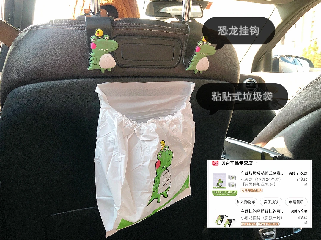 粘贴式垃圾袋⭐️⭐️⭐️⭐️ 天天带娃出门耍,每天车上都是乱七八糟 垃圾袋,香蕉皮,零食渣,水壶,到处乱放 每天后座都是一片狼藉 很推荐妈妈们入手这个好看又还用的垃圾袋哦 粘贴式的,用完直接撕掉扔垃圾桶 除了粘性不是很强,其余都挺好的 培养宝宝好习惯 - 小恐龙挂钩⭐️⭐️⭐️⭐️ 这个为了配垃圾袋好看买的,很不错哦! 挂个水壶,挂零食,水果 让后座看起来整洁不少👍👍👍👍 -