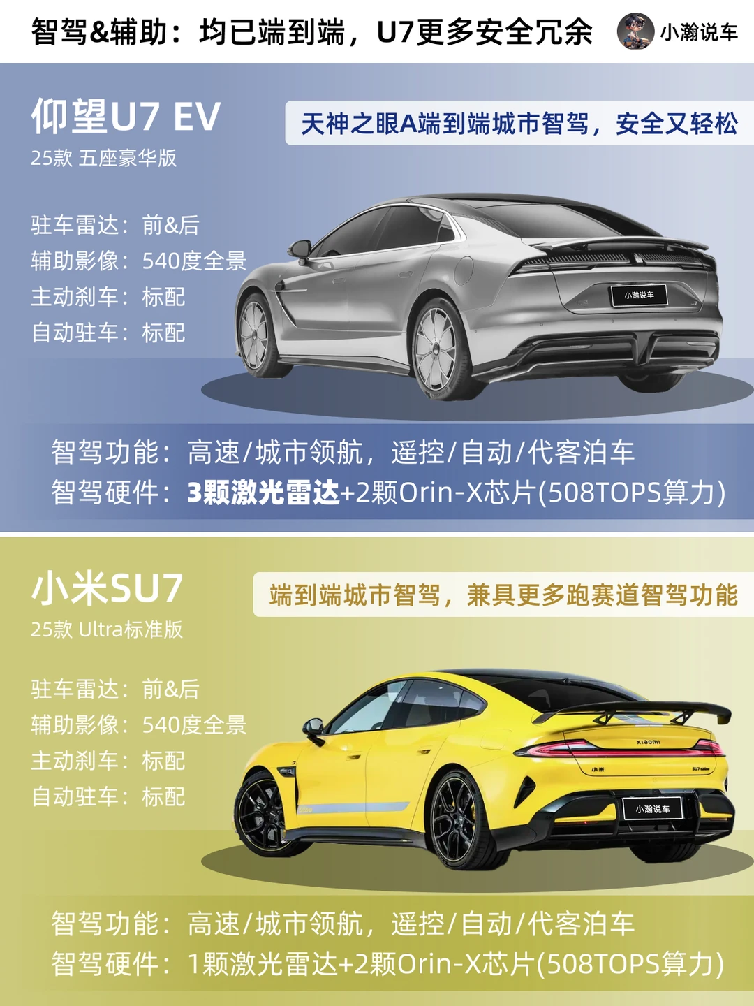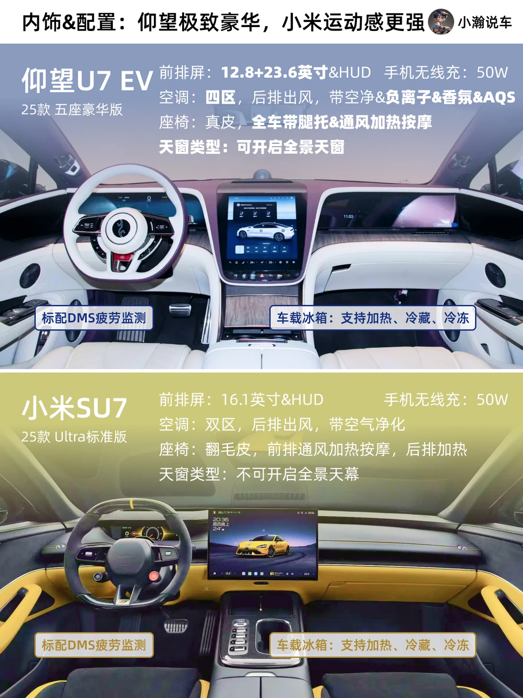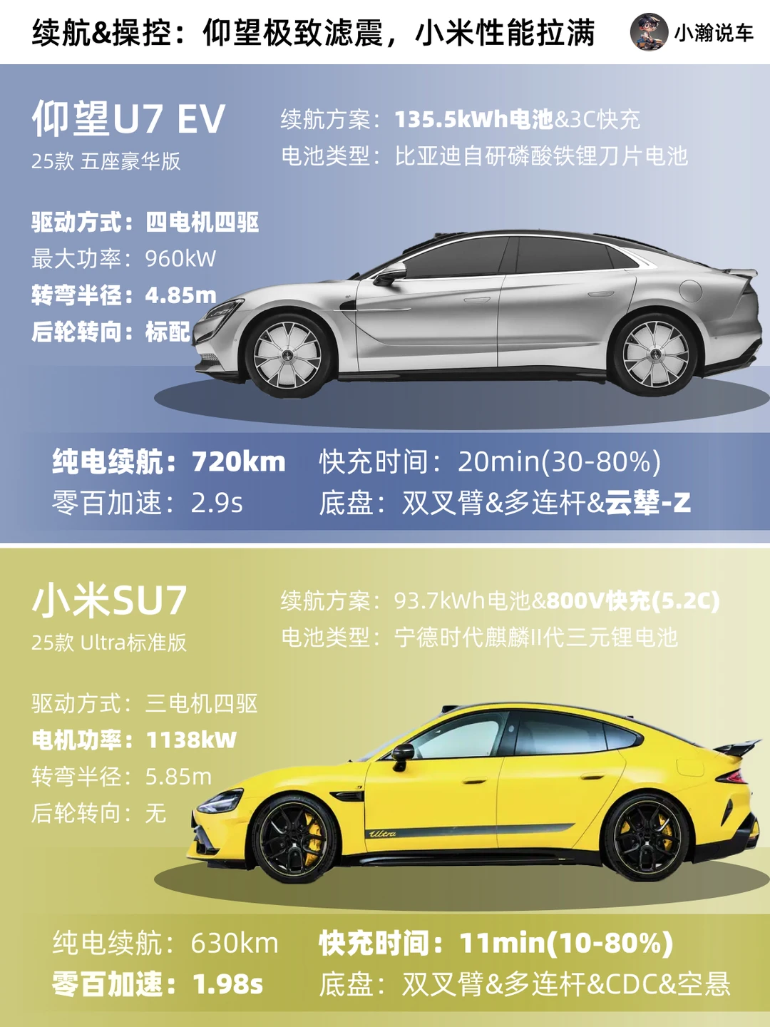 [哇R]相比于赛道上的出色成绩,仰望U7靠一系列黑科技带来的便利、舒适、安全的驾车体验也势必吸引一批高净值用户!虽然是不同定位的车,但或许之前一批并不下赛道却痴迷SU7 Ultra的宝子也会因为U7这个价格而犹豫。那么如果你有63万,你怎么选?