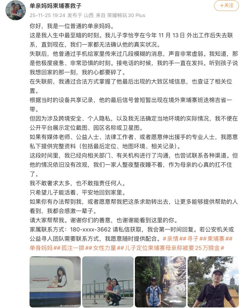 据@单亲妈妈柬埔寨救子账号发布的信息显示,其儿子李怡亨最后信号曾短暂出现在境外柬埔寨班迭棉吉省一带,“失联后,他曾通过手机给家里传来过几段模糊的消息,声音非常虚弱。”“直到现在,我们一家都无法确认他的真实状况。”