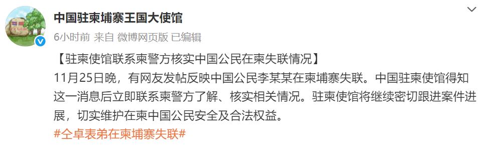 11月25日晚,有网友发帖反映中国公民李某某在柬埔寨失联。中国驻柬使馆得知这一消息后立即联系柬警方了解、核实相关情况。驻柬使馆将继续密切跟进案件进展,切实维护在柬中国公民安全及合法权益。