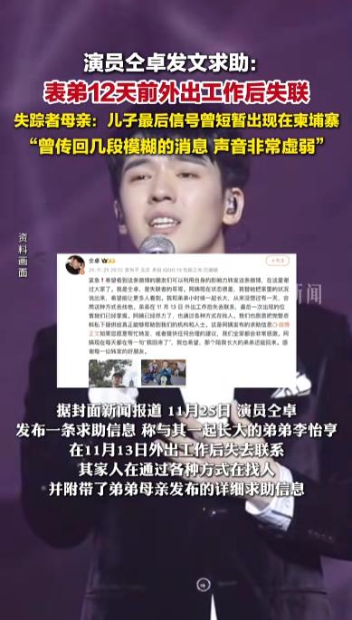 据封面新闻报道,11月25日,演员仝卓发布一条求助信息,称与其一起长大的弟弟在11月13日外出工作后失去联系,其家人在通过各种方式在找人,并附带了弟弟母亲@单亲妈妈柬埔寨救子发布的详细求助信息。
