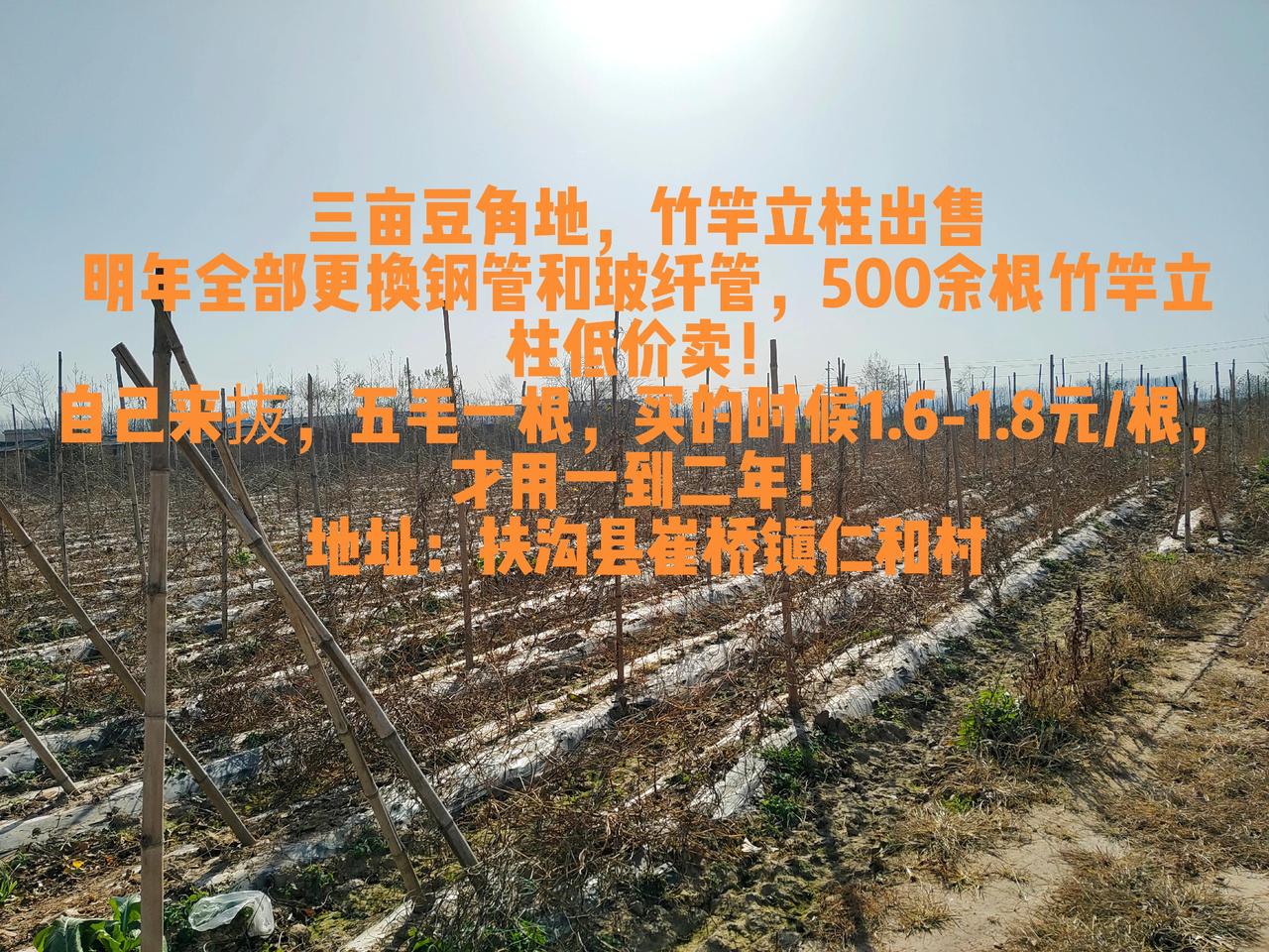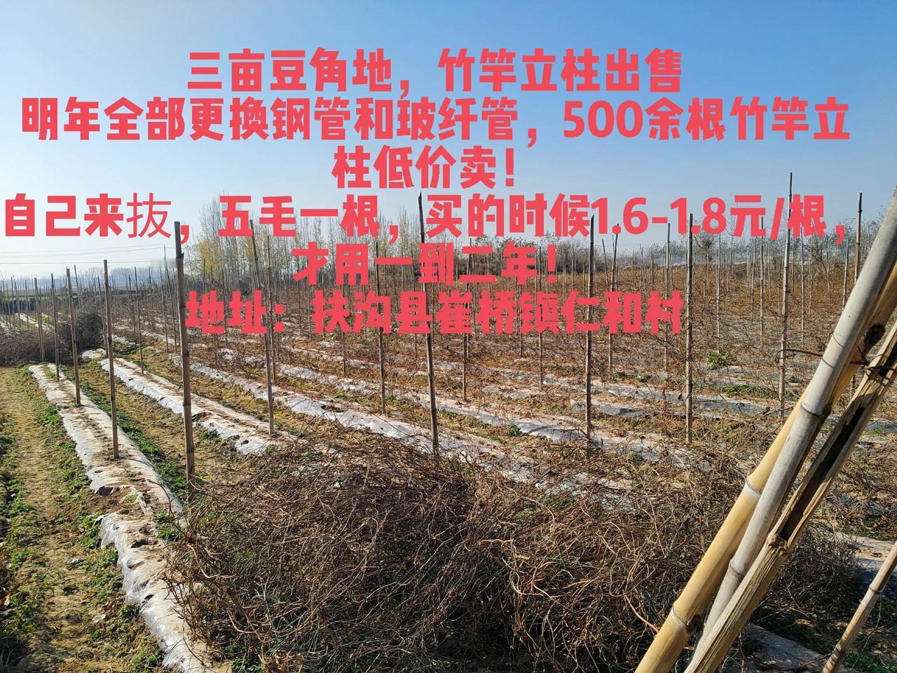 三亩豆角地,竹竿立柱出售 明年全部更换钢管和玻纤管,500余根竹竿立柱低价卖! 自己来抜,五毛一根,买的时候1.6-1.8元/根,才用一到二年! 地址:扶沟县崔桥镇仁和村 有意向和问题,留言或私!农业种植 乡村振兴dou行动 新农人计划 重要事情说三遍