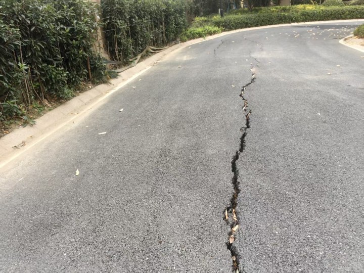 接到反映后,橙柿直通车记者来到远洋西溪公馆竹窗苑,在3幢和5幢间的停车场位置靠荆长路的柏油道上有一条长长的裂缝,约十米长。裂缝最宽处约有两指宽,靠荆长路边有明显下陷状。