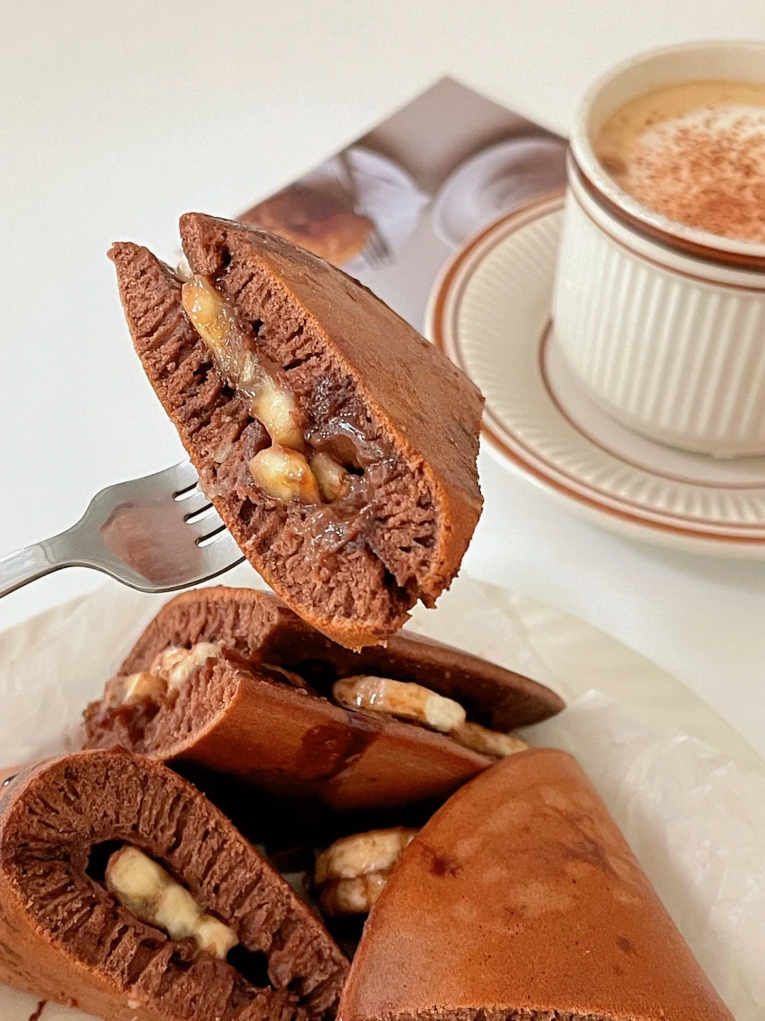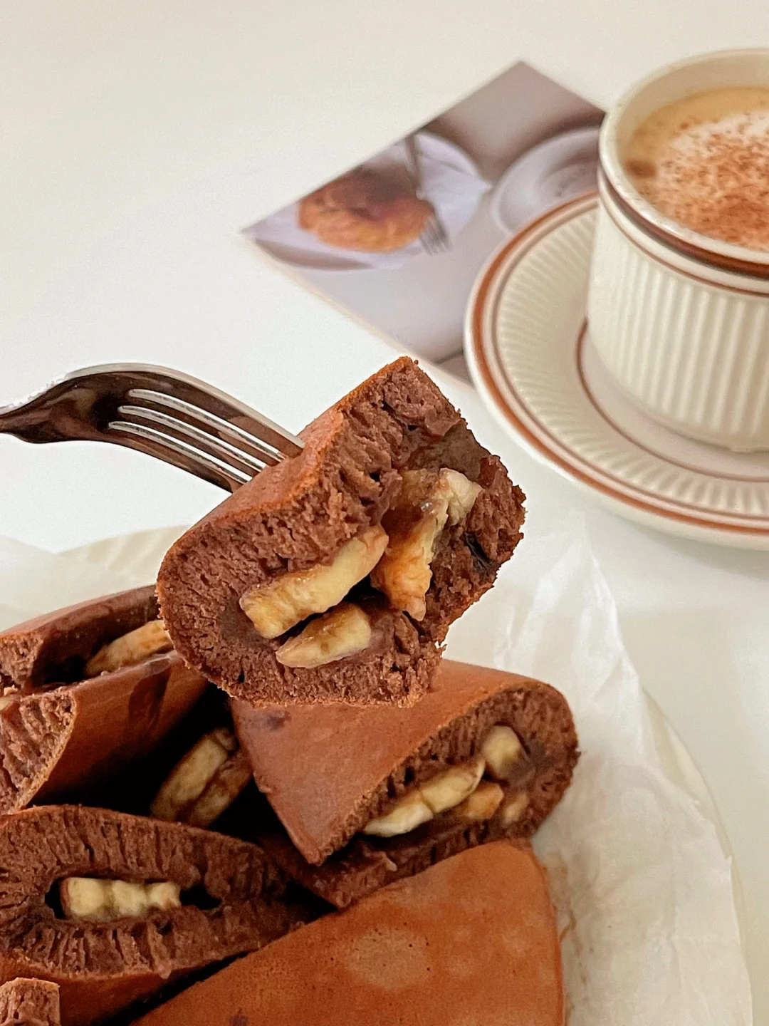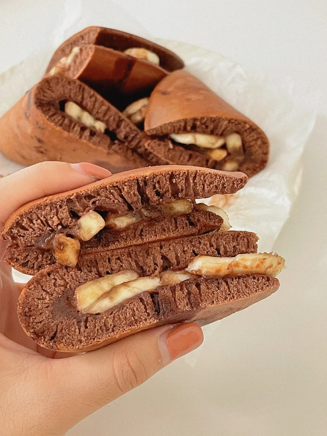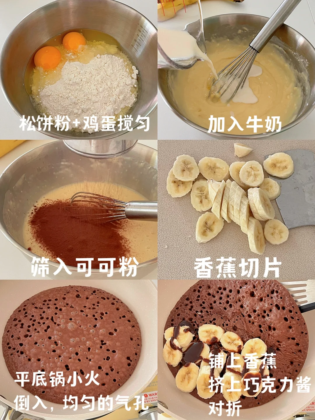 最近一直馋的松饼[哇R]下午茶安排 巧克力口味+香蕉夹心![皱眉R] 松松软软还会爆浆,操作简单 -详细做法看图4🔍 -👩🏻🍳准备材料 松饼粉150克|鸡蛋3个|白砂糖5克|可可粉8克 牛奶90克|香蕉2根|适量巧克力酱 -👩🏻🍳做法步骤 1️⃣松饼粉+鸡蛋搅匀,加入牛奶 2️⃣把可可粉筛入,搅匀 3️⃣香蕉切片备用,平底锅小火 4️⃣倒入粉浆,小火慢煎🈶️均匀的气孔起来 就可以对折翻面了 5️⃣码上香蕉片,挤上巧克力酱,对折 6️⃣拿出来切块即可享用[色色R][色色R][色色R]