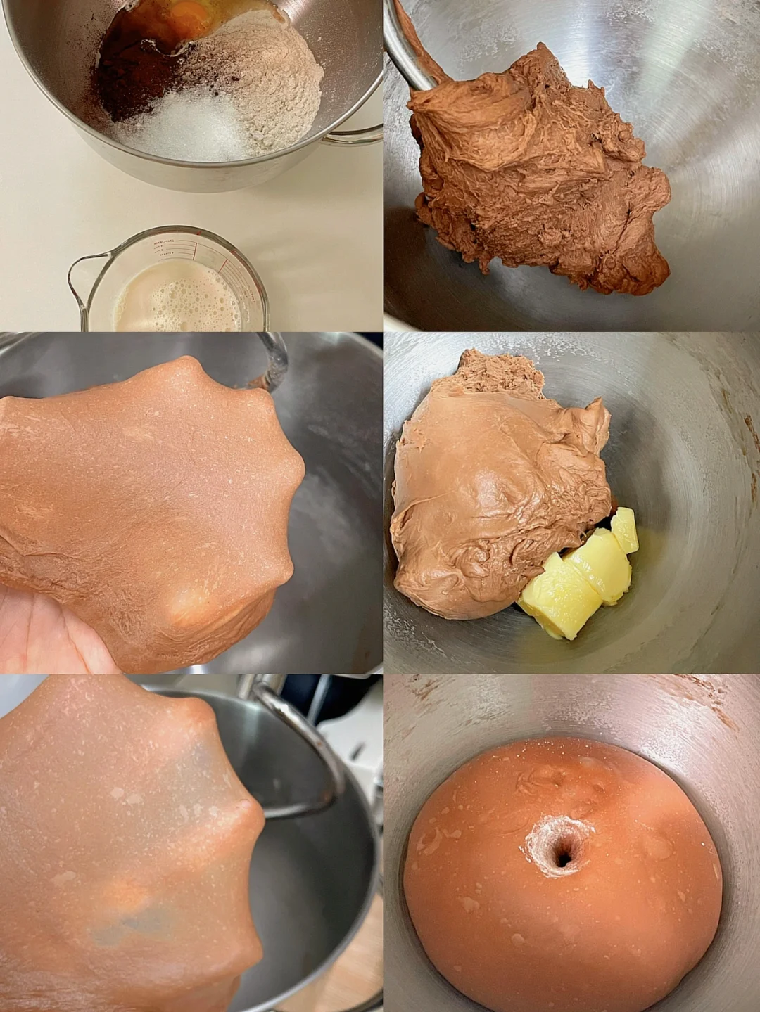 1️⃣除黄油外所有材料放入打面桶,揉出粗膜后加入