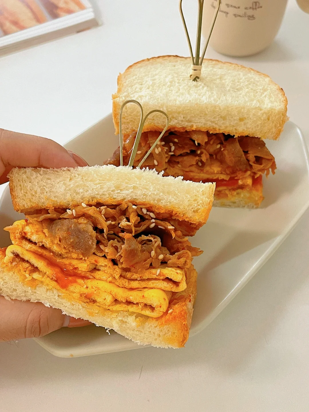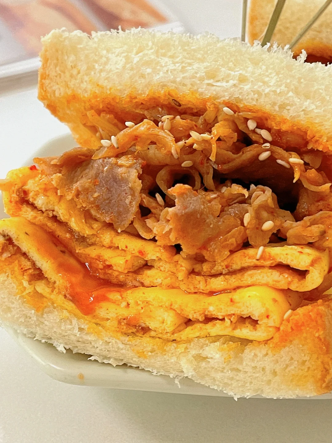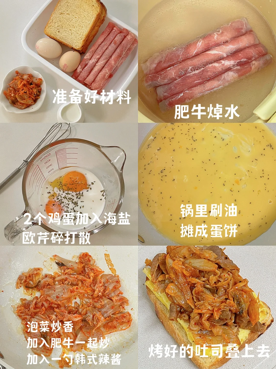 烤过的吐司脆脆的,搭配酸辣的泡菜肥牛,鸡蛋