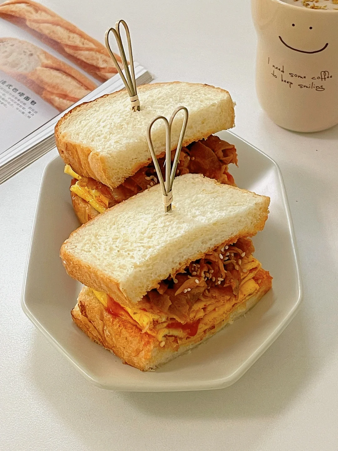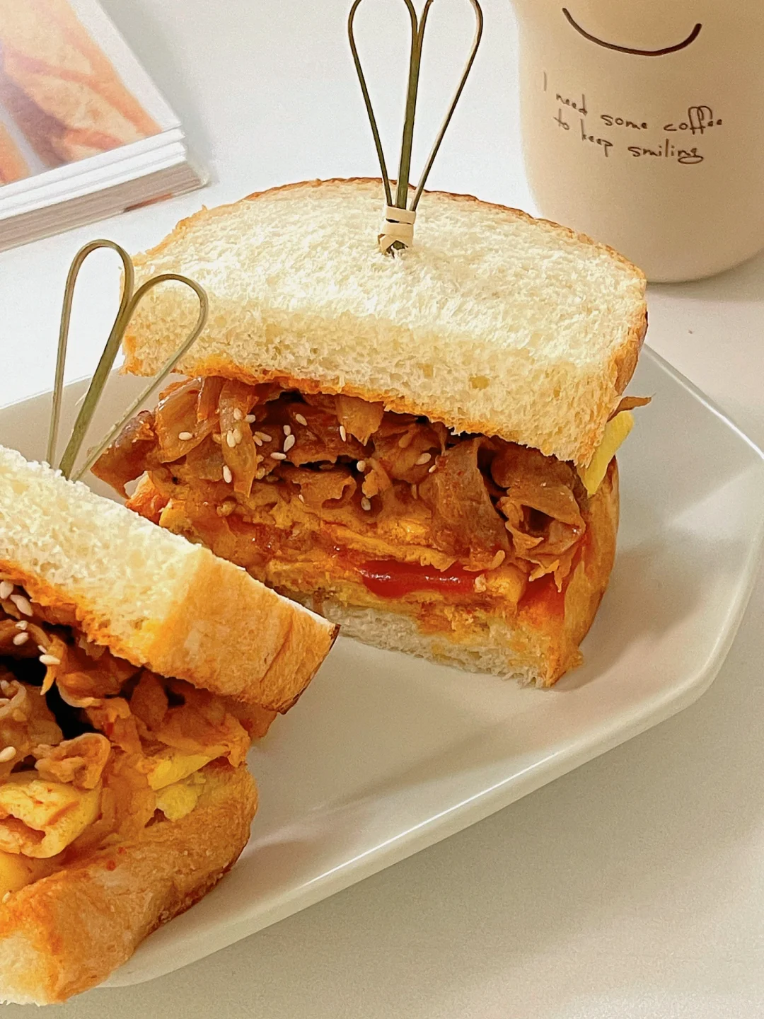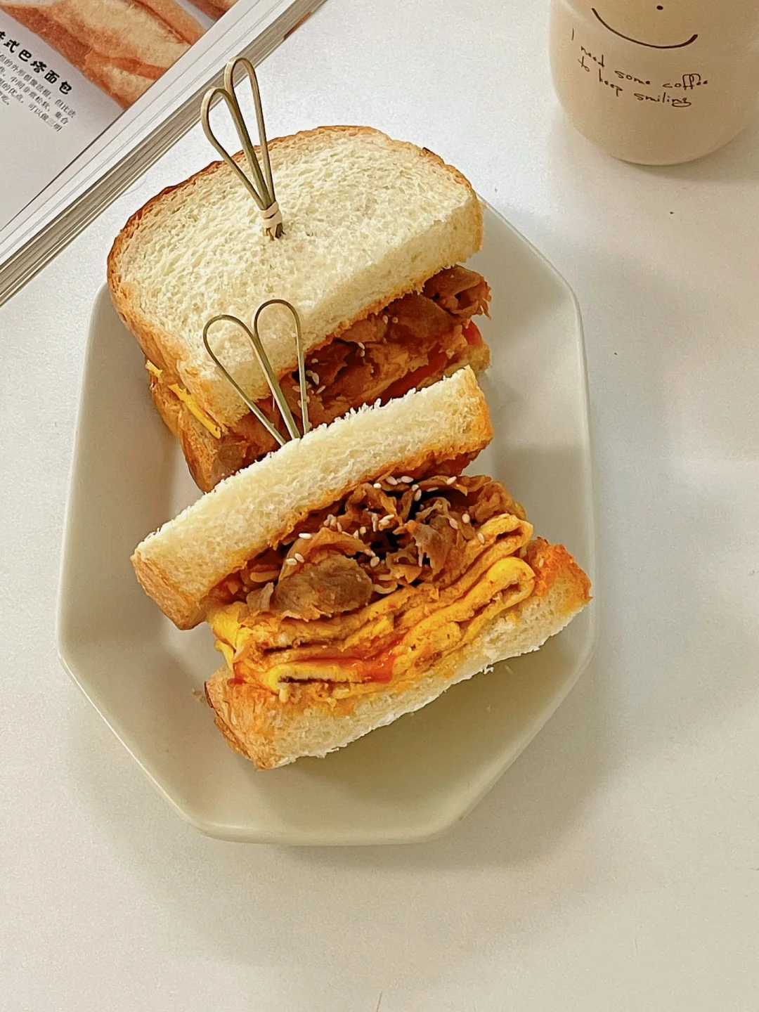 烤过的吐司脆脆的,搭配酸辣的泡菜肥牛,鸡蛋