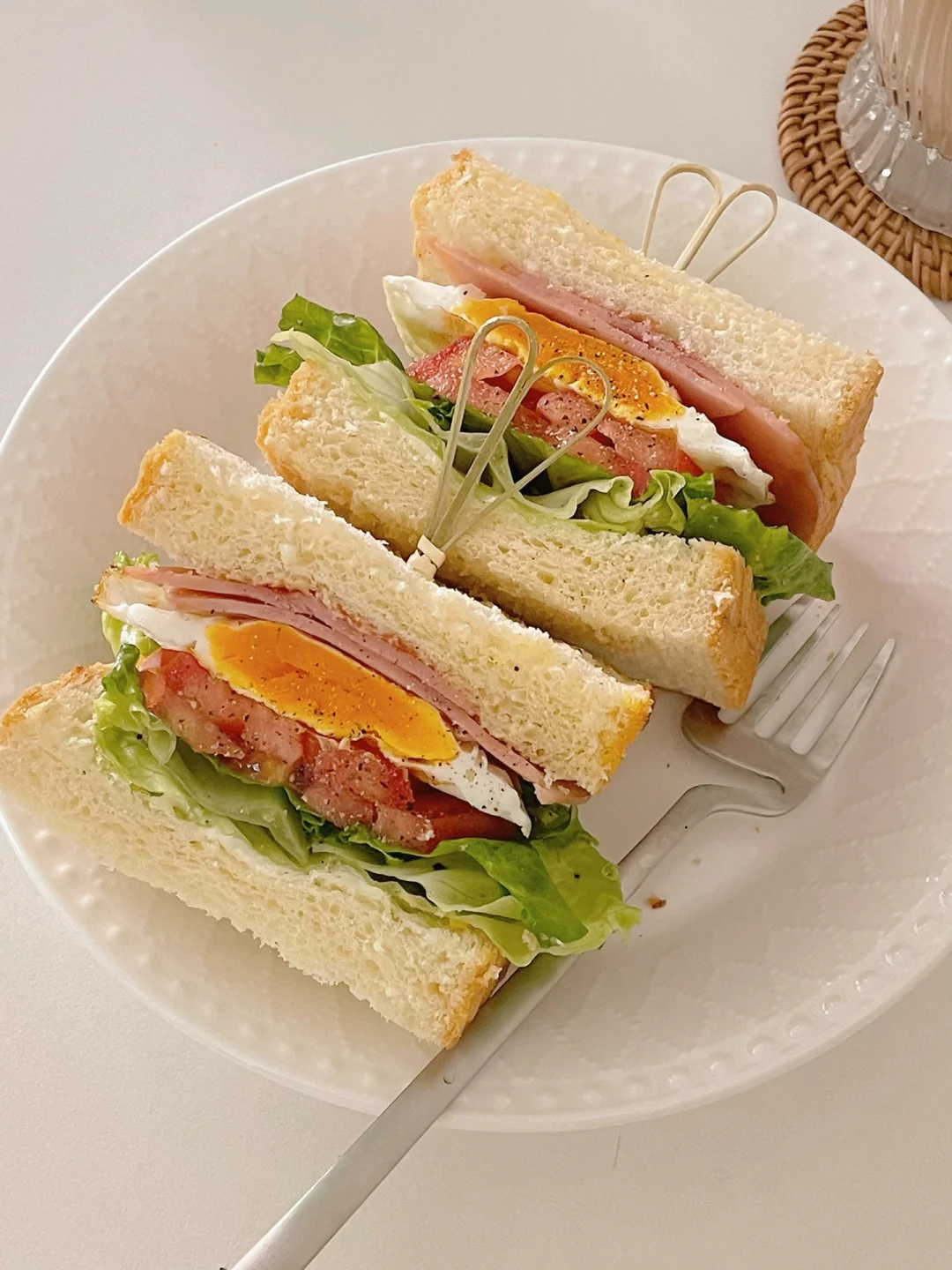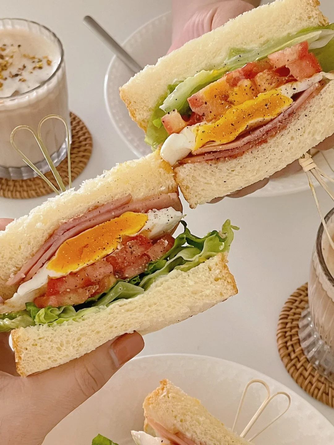 频繁的记录是因为生活值得☀️ 一些感到幸福的瞬间~ 周末愉快呀📅 今日是消耗吐司行动/ 火腿片|生菜|番茄|鸡蛋|适量沙拉,番茄酱 一口开启元气满满的周末[派对R]