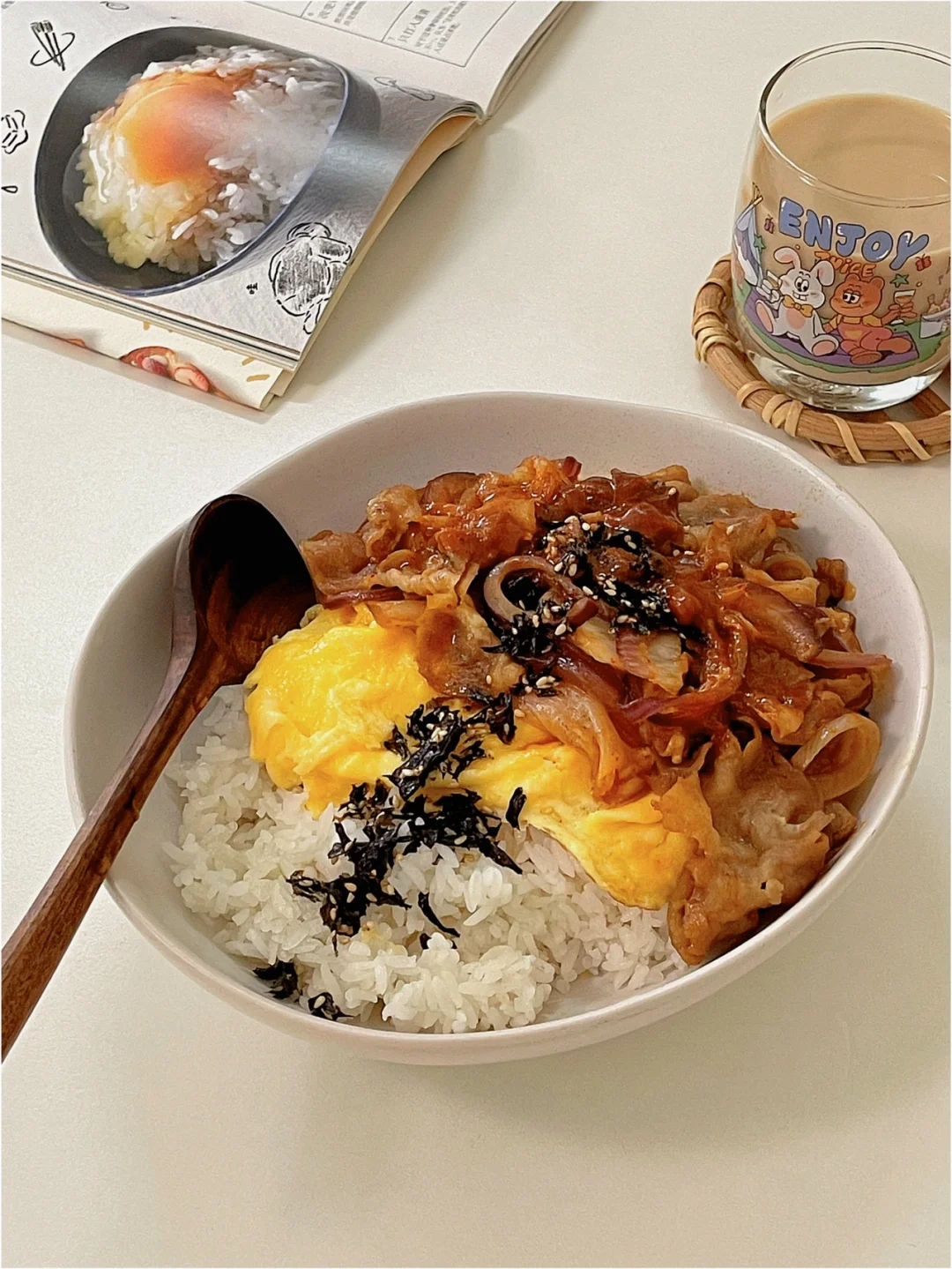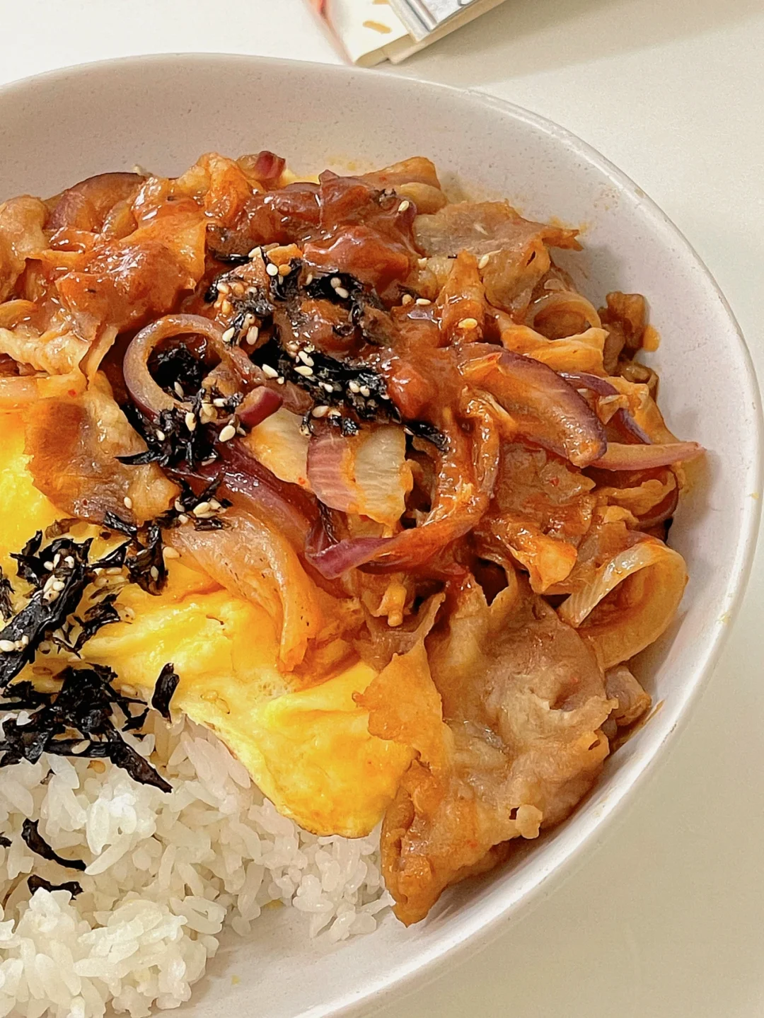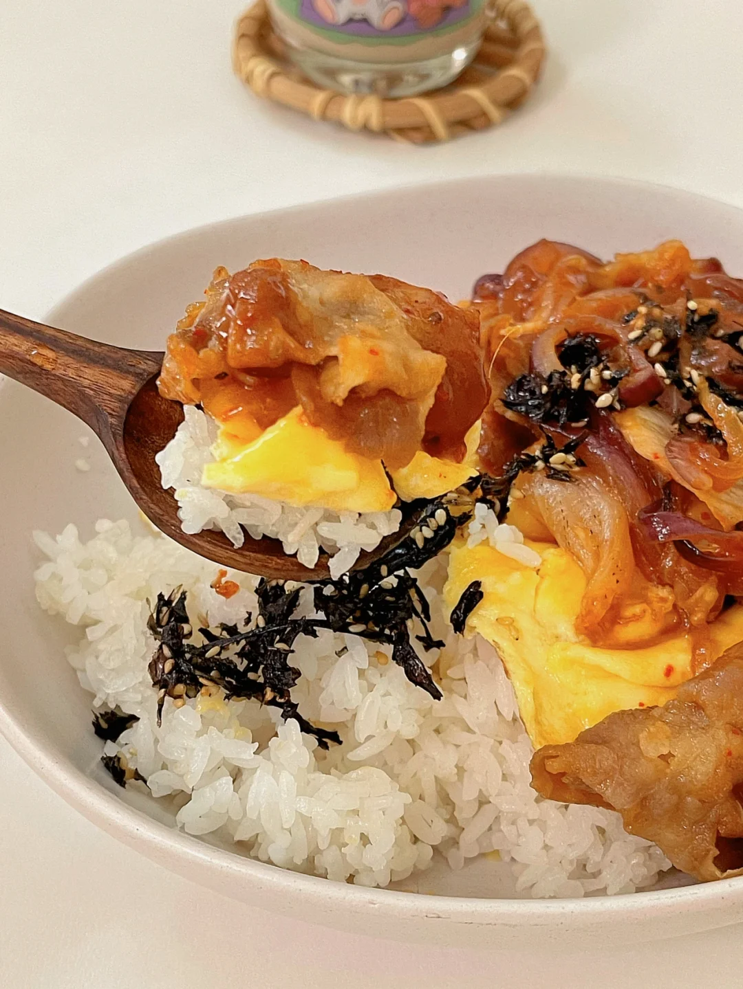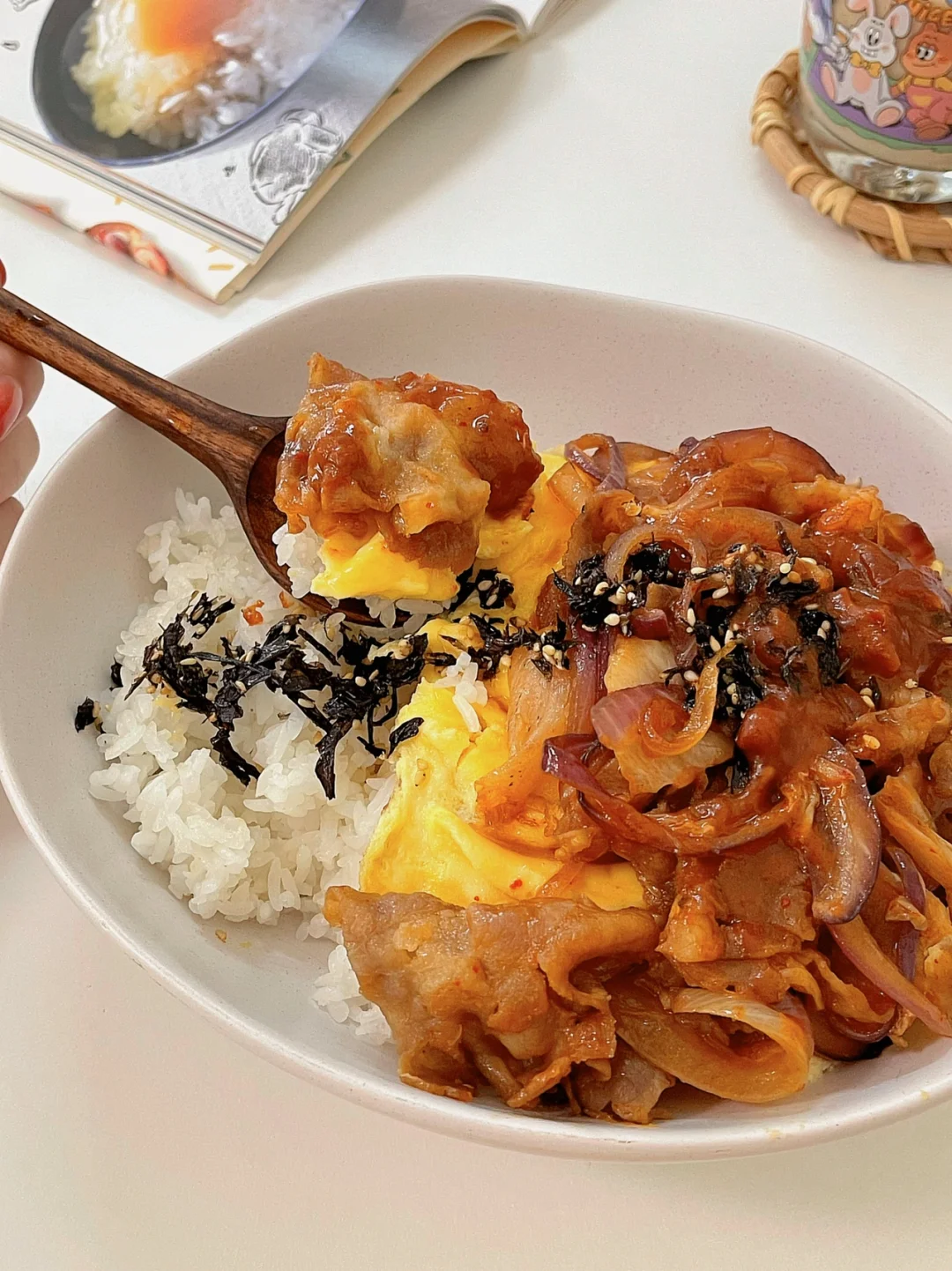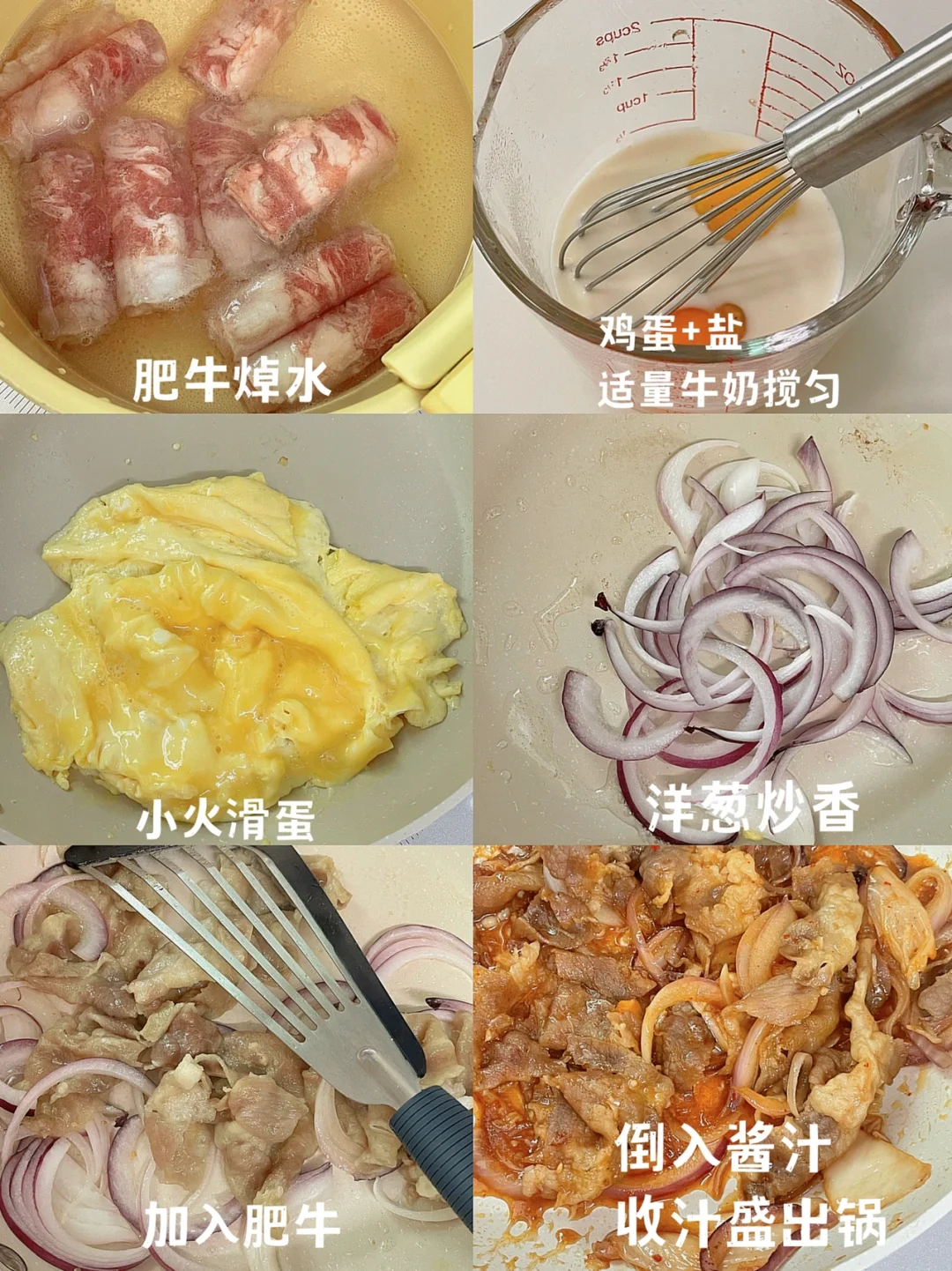 被酱汁裹满的米饭真的好香🍚 酸酸辣辣,打开食欲,每一口都是幸福[赞R] 简单好吃的料理~快点做起来✅ -详细做法看图4.5🔍 -👩🏻🍳准备材料 洋葱|肥牛|鸡蛋|牛奶|海苔|泡菜|特调酱汁 -👩🏻🍳做法步骤 1️⃣肥牛焯水变色捞出备用 2️⃣鸡蛋加入适量盐,牛奶搅匀,小火滑蛋 3️⃣洋葱炒香,加入泡菜,肥牛,淋上酱汁煮浓稠 4️⃣全部盖在米饭上就可以开吃啦[赞R]真的超绝👍🏻