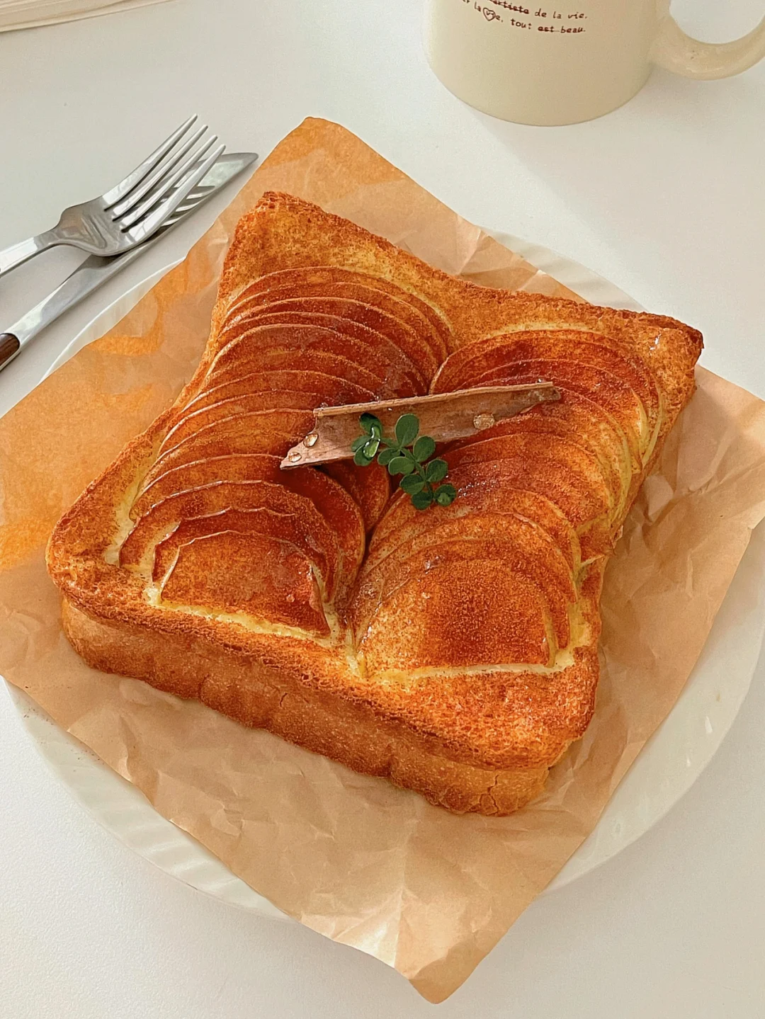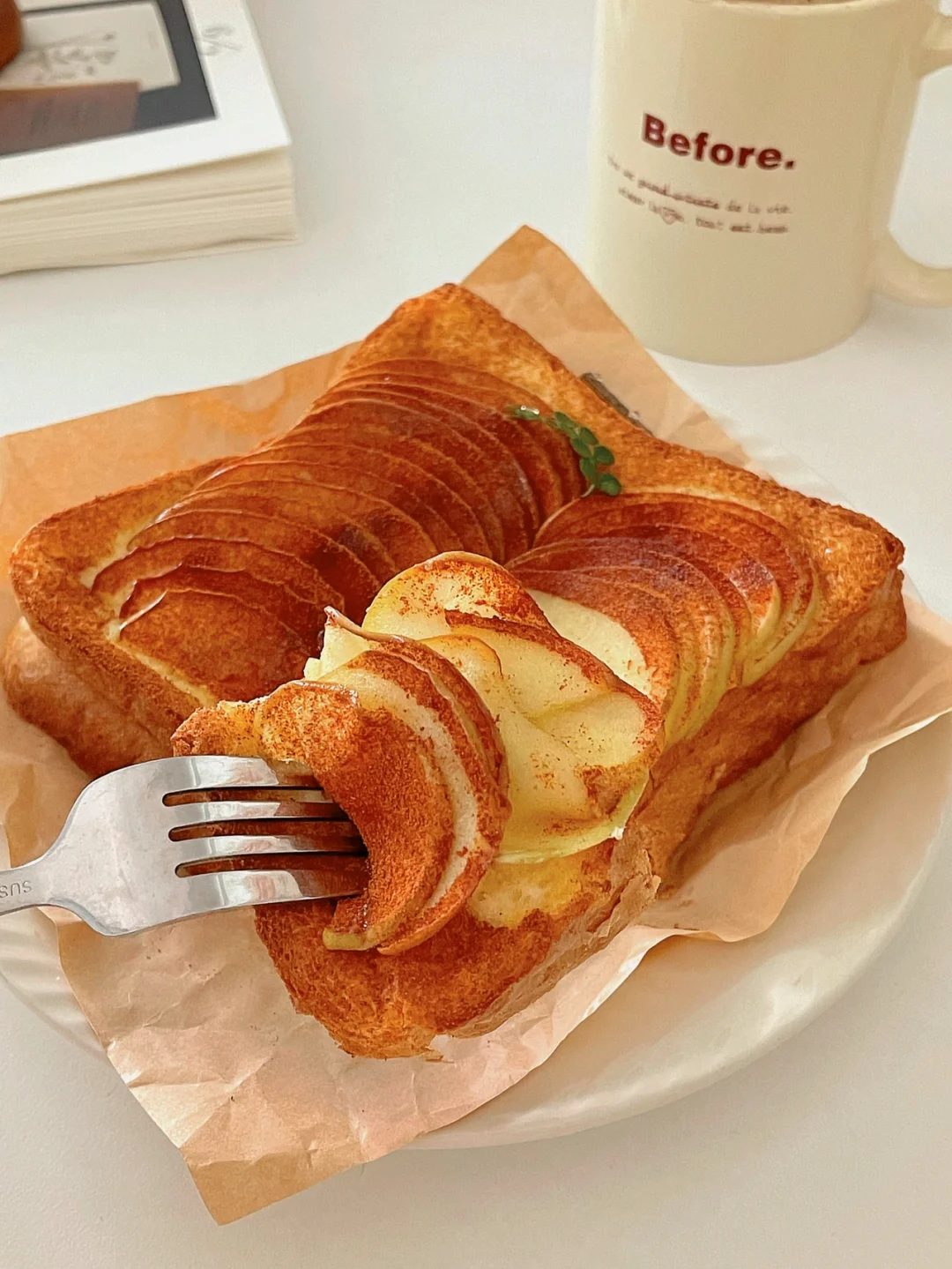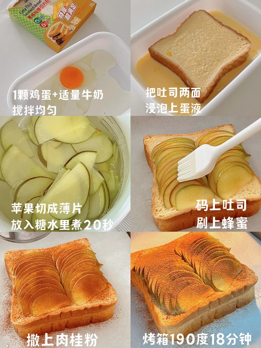 4️⃣把方包放上烤盘,苹果片叠上去