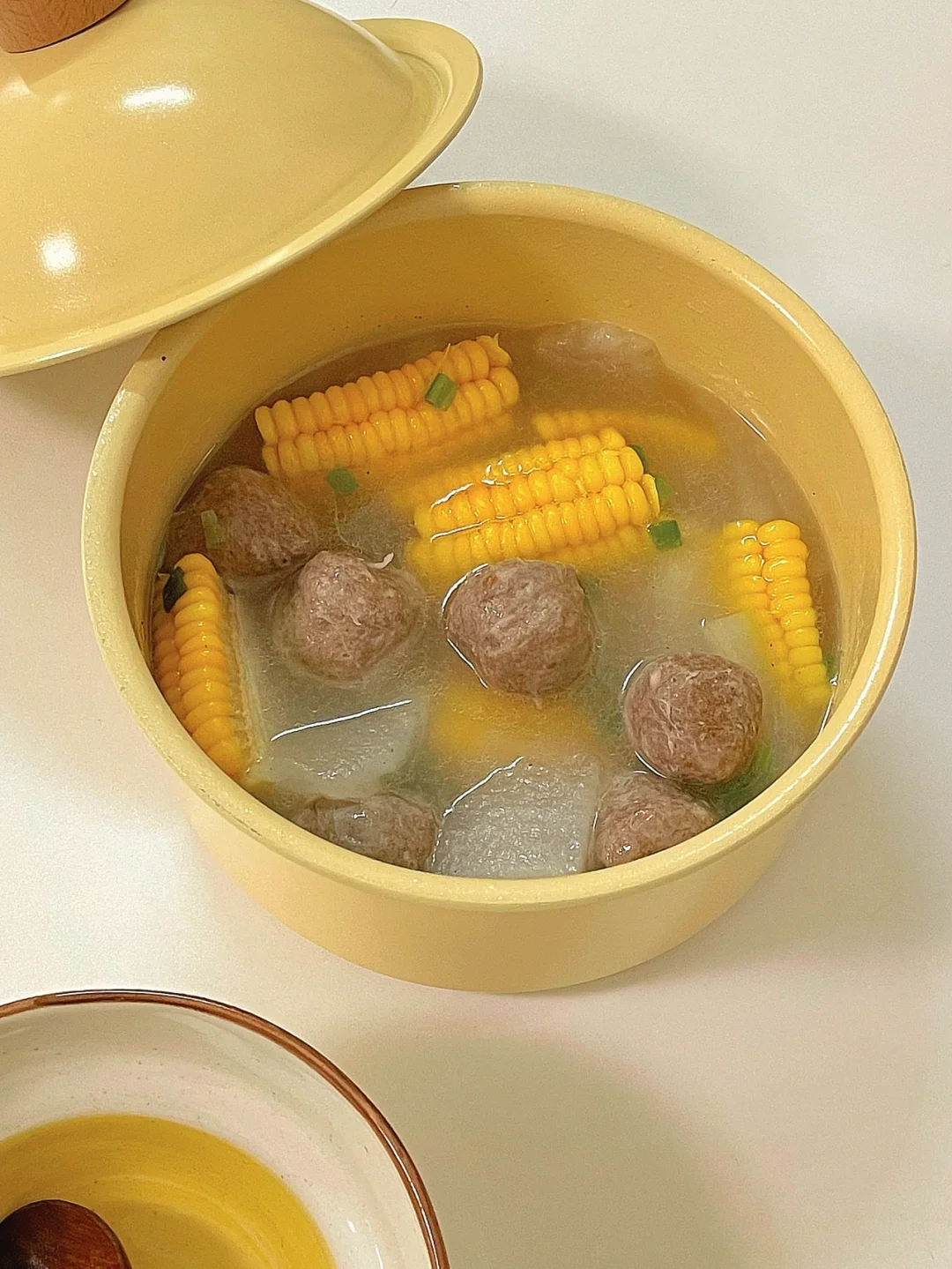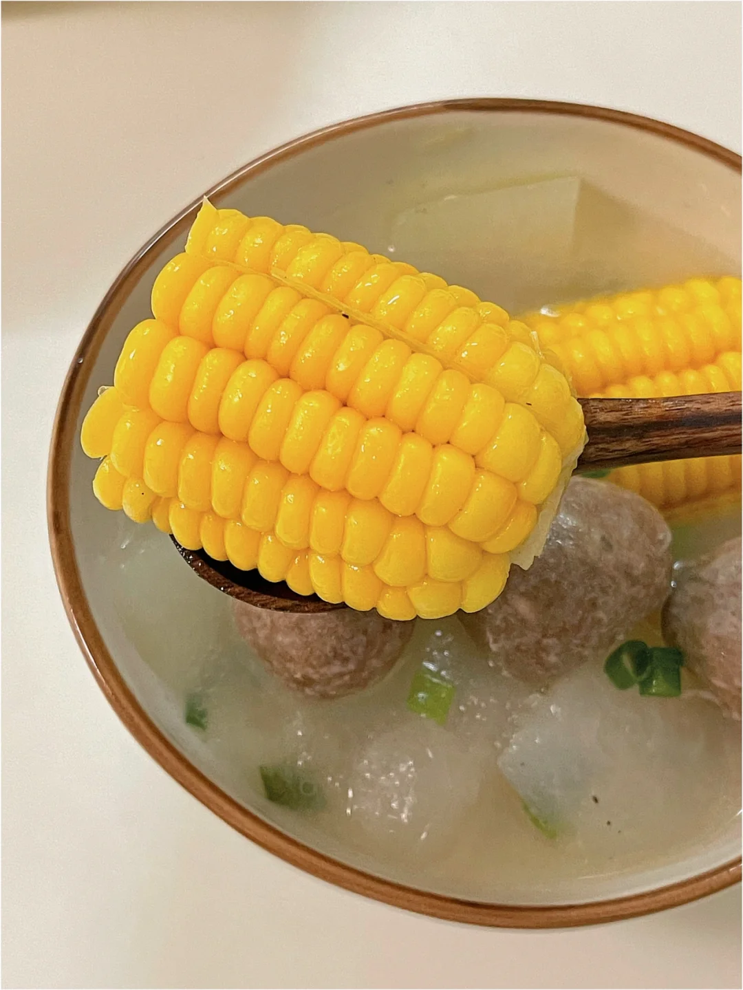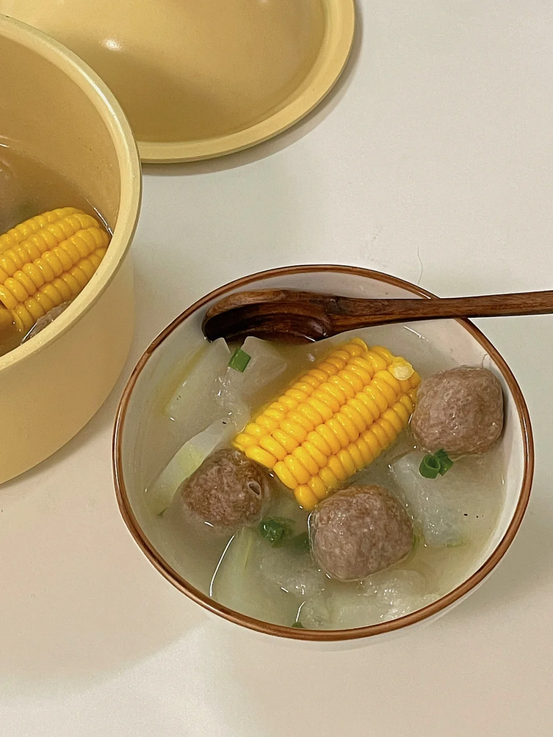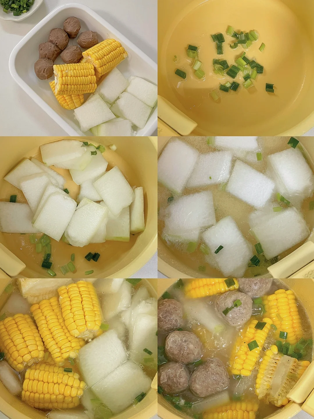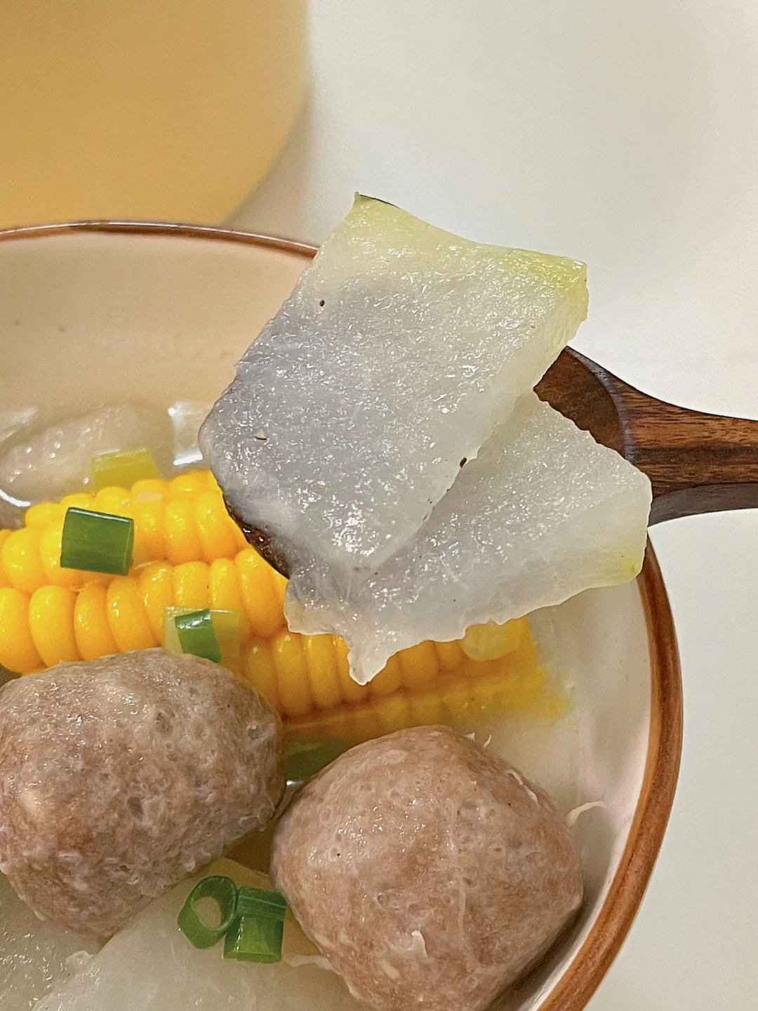 这个牛肉丸冬瓜玉米汤鲜掉眉毛❗️ 5分钟就可以搞定,简单调味清清爽爽 好喝,简单又掉称🌽 -详细做法看图4🔍 -👩🏻🍳准备材料 1块冬瓜|1根玉米|5颗牛肉丸|适量葱花 -👩🏻🍳做法步骤 1️⃣锅里放一点橄榄油,葱花爆香加入切片冬瓜 2️⃣炒一会儿以后加入2碗开水,煮沸 3️⃣把切好的玉米放进去煮5分钟 4️⃣最后加入牛肉丸,适量盐调味就可以啦~