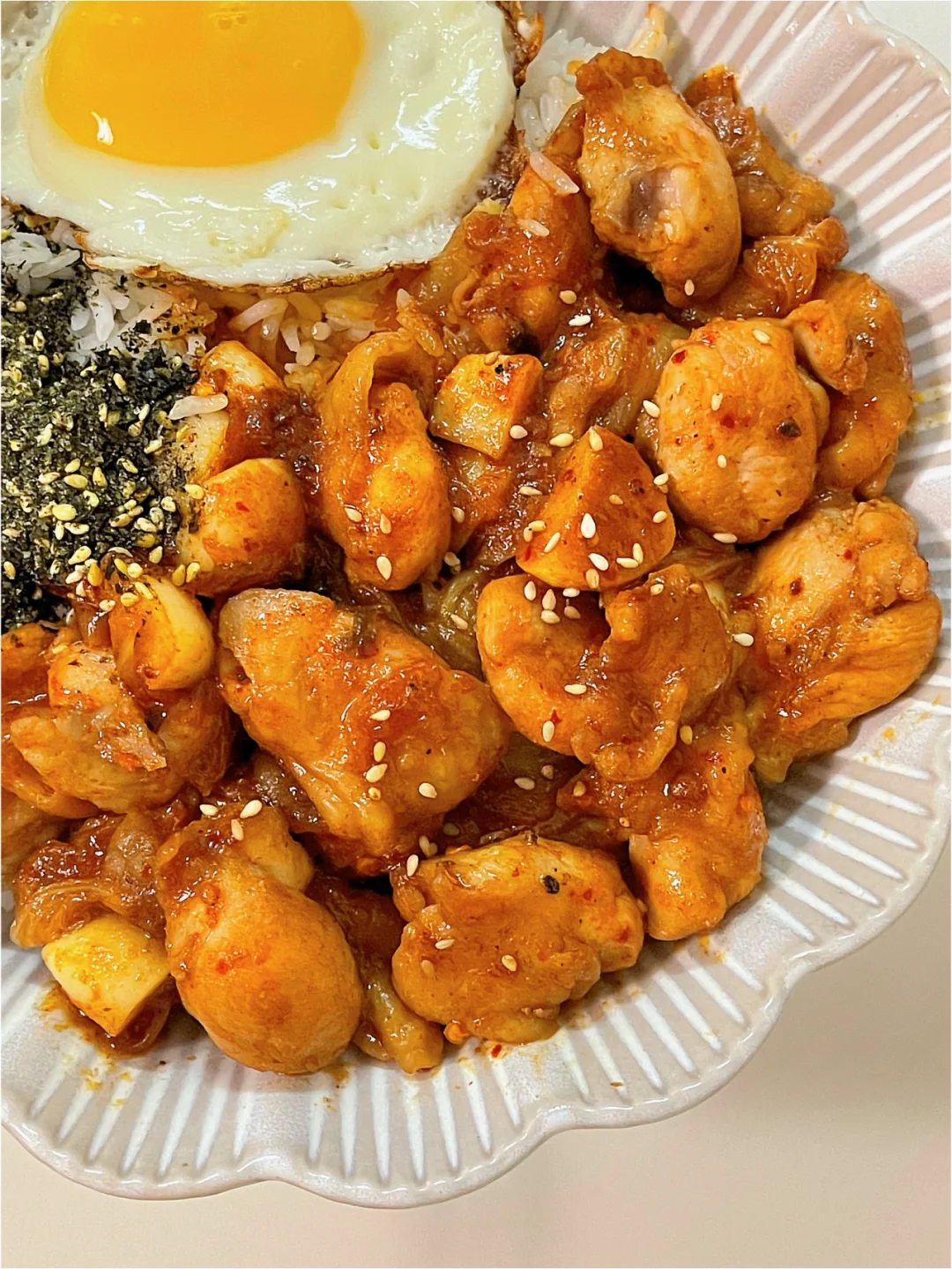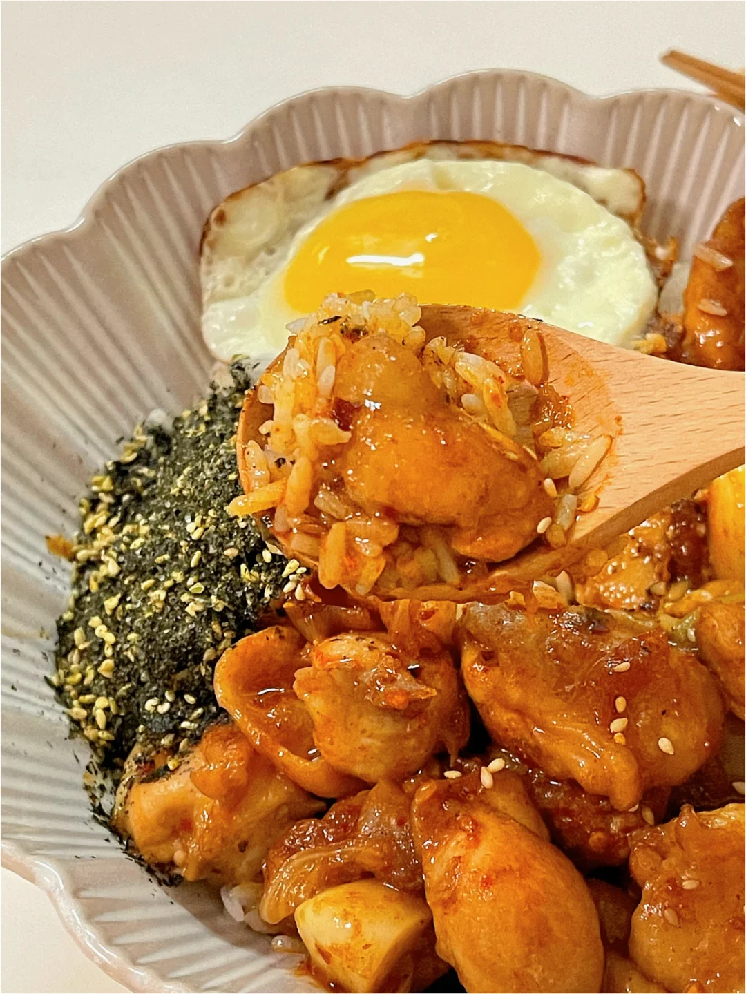 4️⃣翻炒均匀酱汁粘稠即可码在米饭上和海苔碎一起
