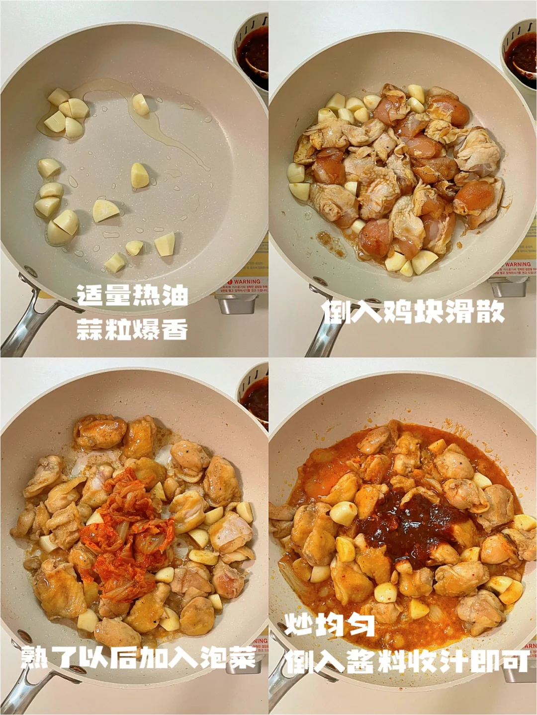 倒入鸡肉炒熟炒色即可加泡菜炒匀,最后加入酱汁