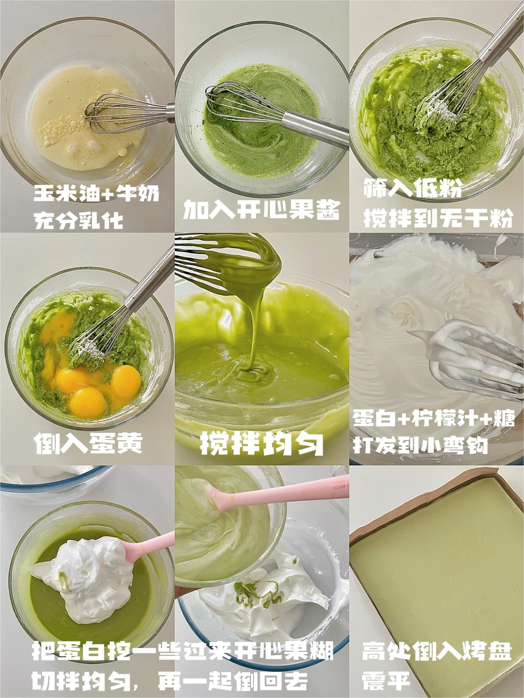 5️⃣挖一部分过来开心果糊这边翻拌均,再一起倒回来蛋白用切拌手法从底下翻上来要混合均匀⚠️