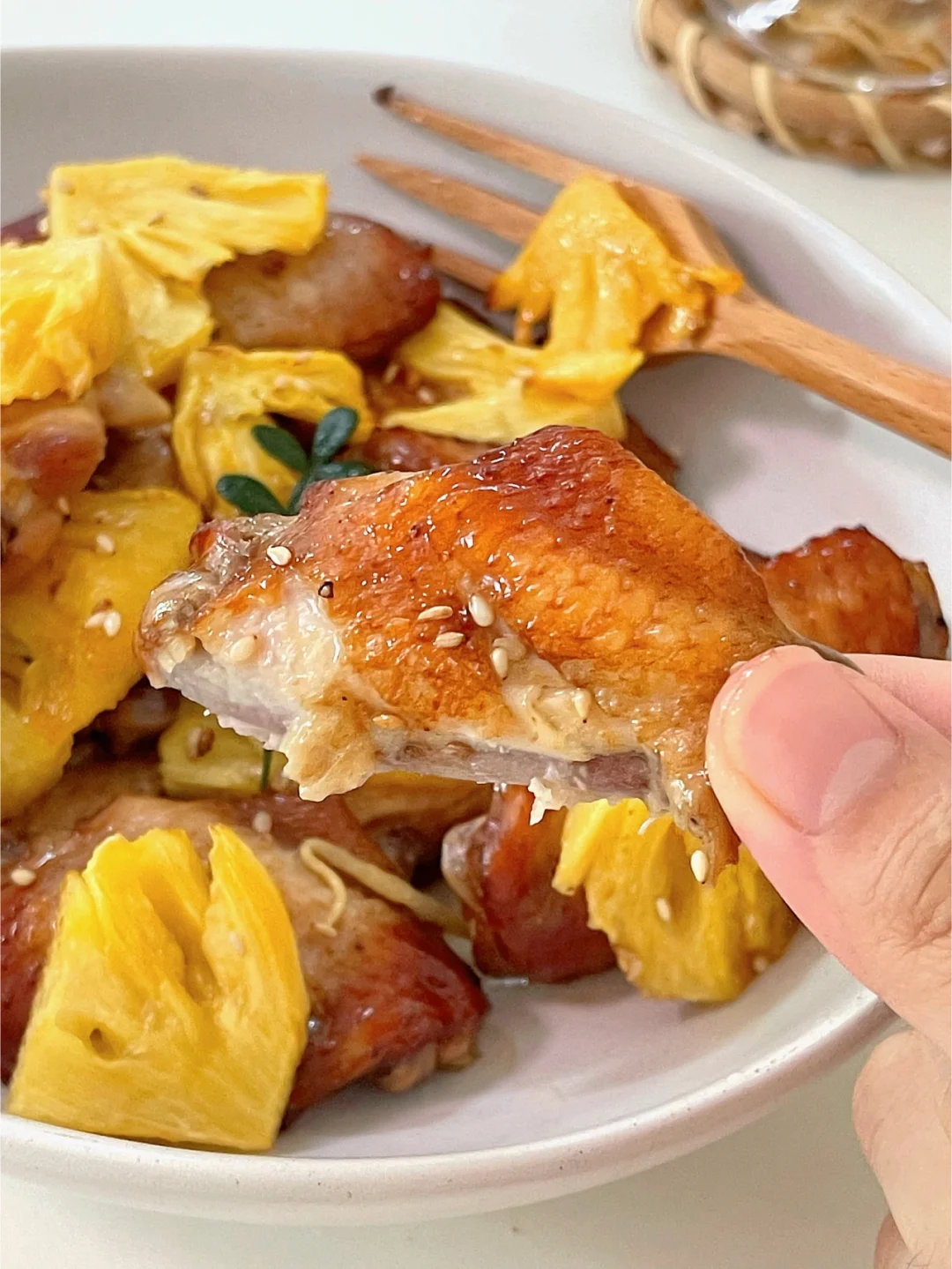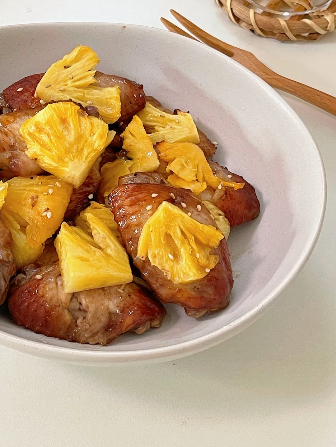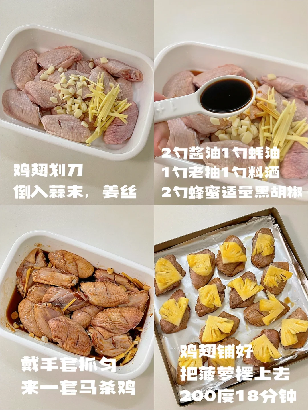 夏天到了,应季的水果,用它做一些美食[派对R] 外焦里嫩的菠萝烤鸡翅,超简单做起来👍 教程看图3🔍 👩🏻🍳- 1️⃣鸡翅洗干净两面划刀,加蒜末姜丝,2勺生抽 +1勺蚝油+半勺老抽+1勾料酒+1勺蜂蜜+盐 适量黑胡椒,抓匀腌制2个小时 2️⃣把菠萝去皮切片,腌制好的鸡翅码烤盘上,每个鸡翅 上都放一片菠萝 3️⃣烤箱预热,烤制180度30分钟左右 中途把烤出来的汁水倒掉,最后5分钟把菠萝移到一边, 完整上色刷上蜂蜜就可以出炉啦~ 撒上白芝麻点缀,尽情享用美食吧[哇R][哇R][哇R]