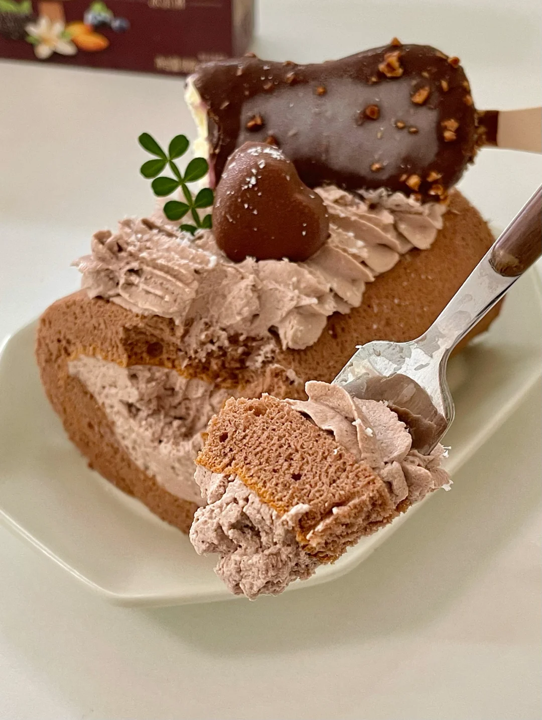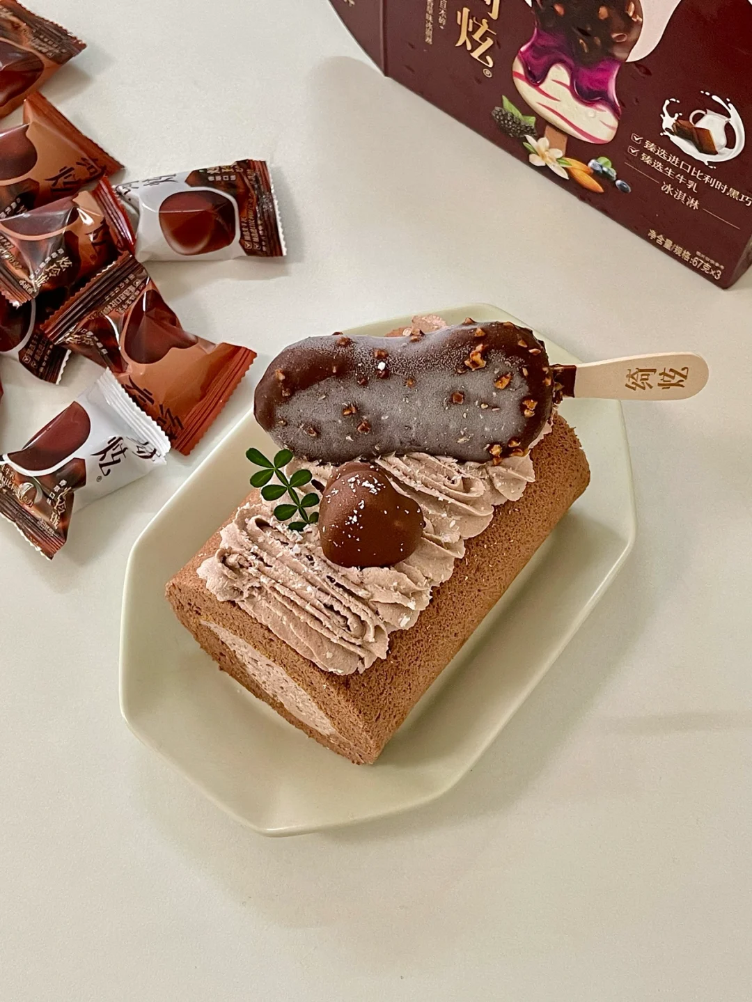 这个装饰我用的是绮炫冰淇淋100%臻选生牛乳和进口比利时巧克力,不额外添加一滴水,好吃的关键给蛋糕卷增加了风味。