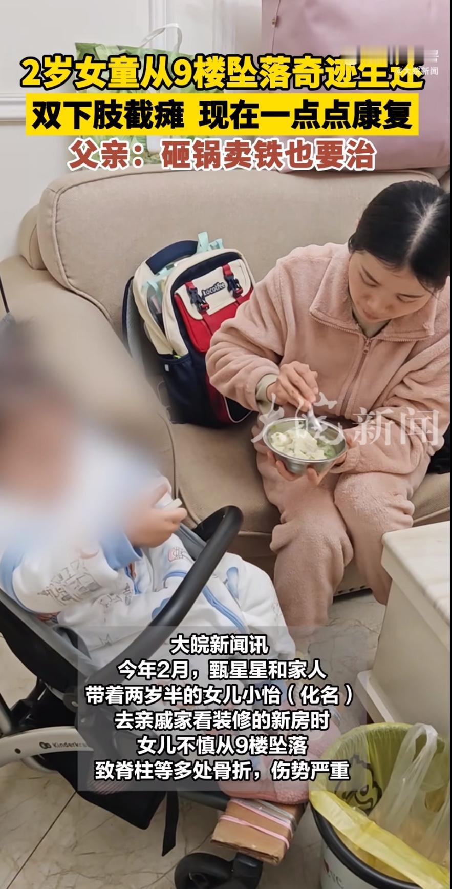 四川安岳的甄星星怎么也没想到,带两岁半女儿小怡去亲戚家看新房,竟成了改变全家命运的转折点。那天,亲戚新房的阳台还没装玻璃,只留了个空框,也没贴警示标志。老人牵着孩子看风景时,装修师傅递了根烟,老人松手十几秒,小怡就从九楼摔了下去。送到医院一查,胸椎爆裂性骨折、脊髓损伤,医生摇头说“恢复希望不大”,最终确诊高位截瘫——孩子这辈子可能再也站不起来了。 更压得人喘不过气的是钱。甄星星在镇畜牧兽医站上班,月薪五千,可小怡的康复费每月要三万。为了救女儿,他下班送外卖、开直播卖货,妻子全职照顾孩子,母亲还得管大儿子上学,家里欠了20多万,每个月还得继续借钱。一根导尿管8元,一天用6根,加上消毒器具、康复训练,琐碎开销堆成山。甄星星红着眼说:“本该在阳光下奔跑的年纪,却坐上了轮椅。我们老了以后,谁陪她?” 这起悲剧像一把刀,剖开了三个残酷现实。第一,安全意识的“侥幸心理”,往往是悲剧的导火索。 亲戚新房没装玻璃、没警示标志,大人却放心让孩子在阳台活动,总觉得“不会那么倒霉”。可意外就像个隐形杀手,专挑松懈的瞬间下手。类似案例太多:郑州3岁女童看房时从7楼未装玻璃的窗户坠落,全身16处重伤;还有孩子爬窗台、钻护栏,最后酿成惨剧。这些事故都在提醒:危险从不提前打招呼,家长多一分警惕,孩子就少一分风险。 第二,弱势家庭的“救命钱”困境,暴露了社会保障的短板。 甄星星一家年收入5万到10万,却要扛50万的治疗费。虽然发起水滴筹筹到近10万,可后续康复是无底洞。农村家庭没大病保险、没积蓄,一场意外就能压垮全家。有网友算过账:导尿管、康复器械、护工费……每月三万只是起步,十年下来就是360万,普通家庭哪扛得住?这背后是医疗保障的缺口——为什么意外险额度只有1万?为什么大病救助不能覆盖更多农村家庭?当“砸锅卖铁”成了唯一选择,社会保障网是否该织得更密? 第三,父亲的坚持里,藏着最朴素的亲情力量。 甄星星没被债务压垮,他把女儿微笑的照片设为手机屏保,送外卖时累得直不起腰,开直播到深夜,就为了多赚几百块药费。他说:“哪怕再苦再难,有一丝希望都不会放弃。”这种不放弃,不是盲目乐观,而是父亲对女儿最本能的守护。就像网友说的:“他扛的不是债务,是女儿活下去的希望。”这种力量让人动容,也让人反思:为什么总要等到悲剧发生,才想起安全的重要性?为什么总要普通家庭独自扛起天价医疗费? 小怡的故事还没结束。她正在慢慢康复,偶尔能露出笑容,可未来还有无数个“明天”等着甄星星去拼。我们没法替他扛债,但能从这件事里学到点什么。比如,带孩子去陌生环境,一定先排查安全隐患——没装玻璃的阳台、没护栏的楼梯,都得盯紧孩子;比如,给家庭买份意外险,别等意外来了才发现保障不够;再比如,遇到困难时别硬撑,多找社区、公益组织求助。 评论区想问问大家:你身边有没有类似的安全隐患?对农村家庭的大病保障,你有什么建议?或者,你曾经历过“不放弃”的时刻吗?说出你的故事,或许能帮更多人避开悲剧,也能让甄星星知道——他不是一个人在战斗。毕竟,每个孩子都是父母的命,每份坚持都值得被尊重。 (案例来源:大皖新闻)