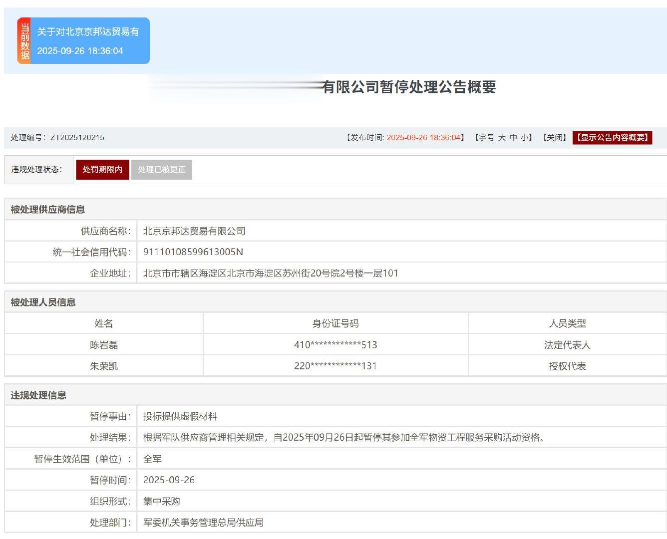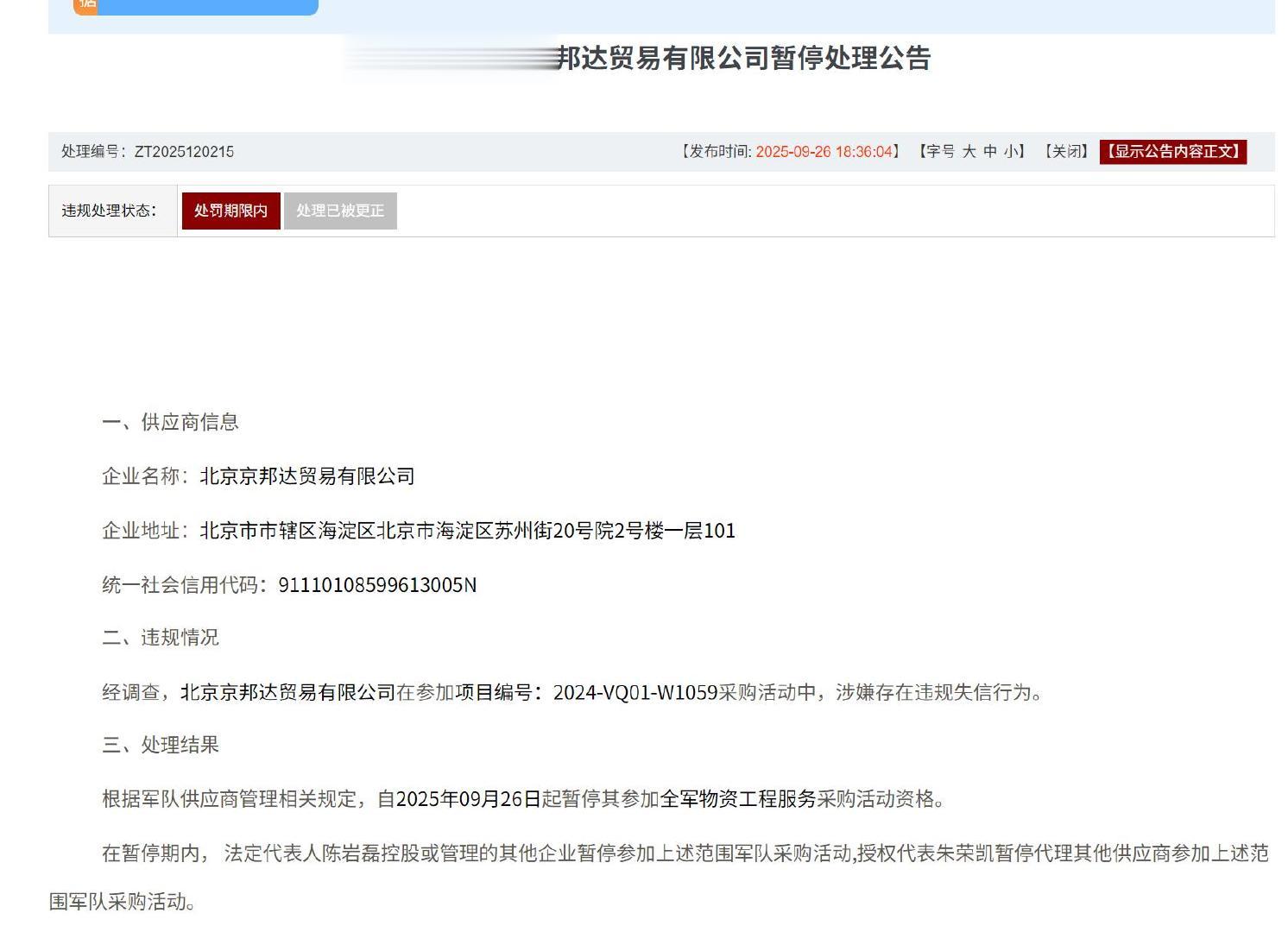 根据军队供应商管理相关规定,自2025年9月26日起暂停北京京邦达贸易有限公司参加全军物资工程服务采购活动资格。