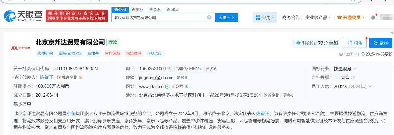 天眼查信息显示,北京京邦达贸易有限公司是京东集团旗下专注于物流供应链服务的企业,成立于2012年8月,总部位于北京,法定代表人为陈谊迁,主要提供快递物流、供应链管理、物流技术服务及相关应用开发,旗下拥有京东快递、京驿货车、京东云仓等产品,覆盖中小件寄递、货运匹配、云仓管理等物流场景。