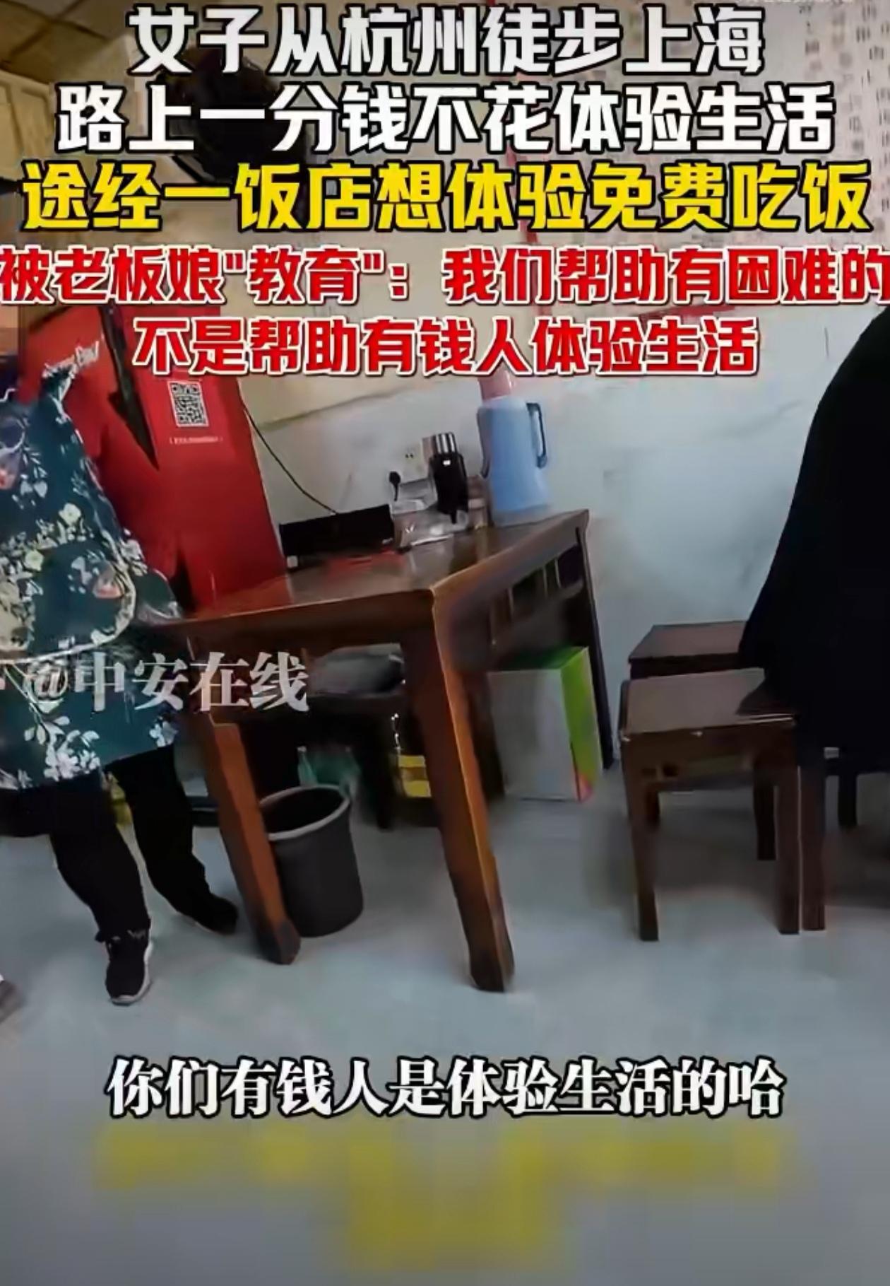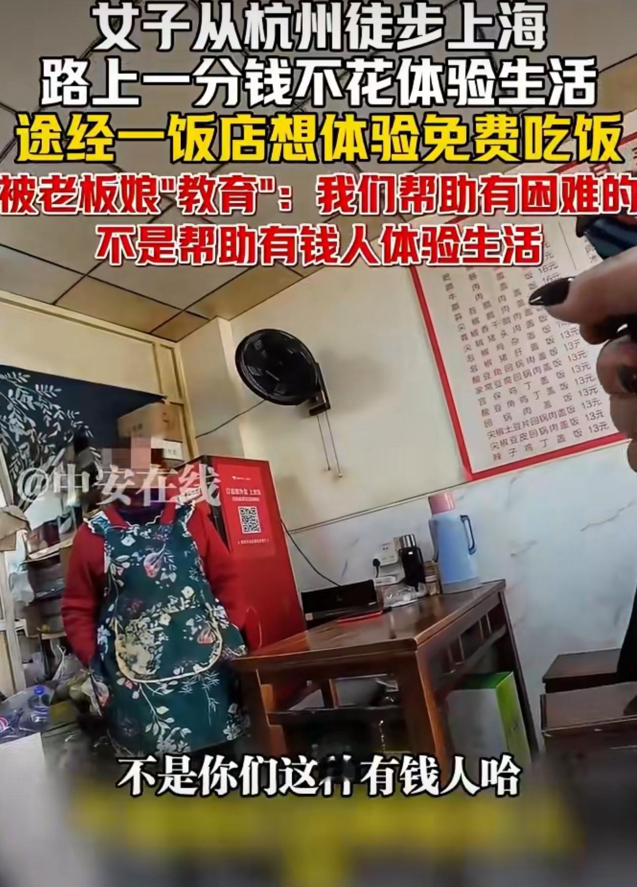 老板娘做得对!我们是帮助有困难的,不是帮助有钱人体验生活! 女子从杭州徒步上海,路上一分钱不花体验生活,途经一饭店想体验免费吃饭,被老板娘"教育"。