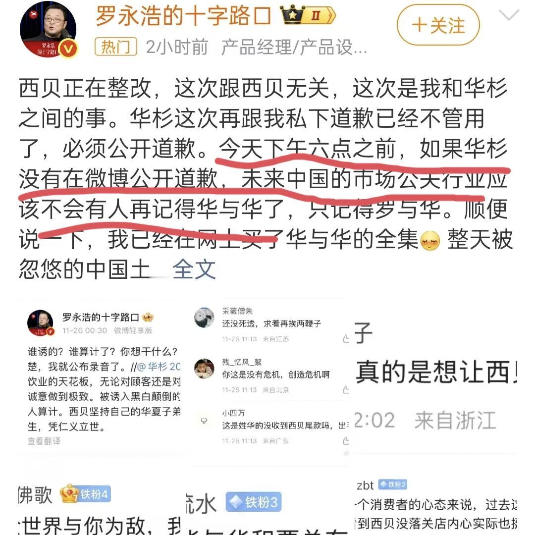 西贝这会估计成了热锅上的蚂蚁了吧, 不是因为生意好起来忙不过来,而是刚能踹口气,又被华与华背刺了。 华与华在网上发文说,西贝被诱入黑白颠倒的网络罗刹国,被人算计了。 明眼人都看得出来,这是在点老罗罗永浩呢,就老罗那爱较真的性格,怎么可能允许自己被冤枉,这会在网上放狠话,如果下午6点前,华与华不公开道谦,老罗会公布录音。 说真的,老罗要是把录音公开了,不少品牌可能都会遭殃,最惨的估计就是西贝了,眼看着好不容易起来生意,又要黄了。 你就说他慌不慌。