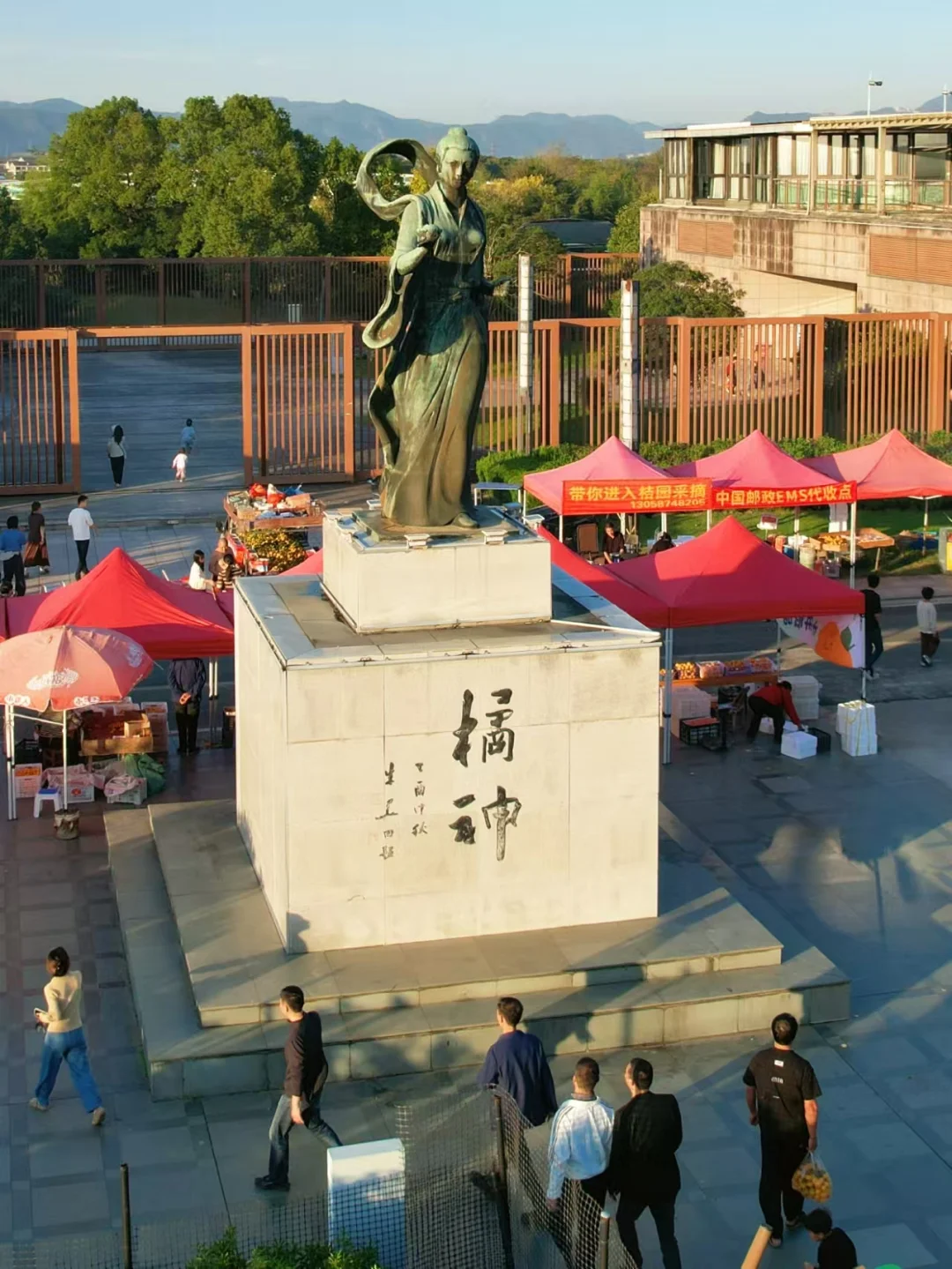 打卡黄岩地标“橘神”雕塑,金黄的橘神手捧蜜橘,背后是漫山橘林,拍照自带秋日氛围感